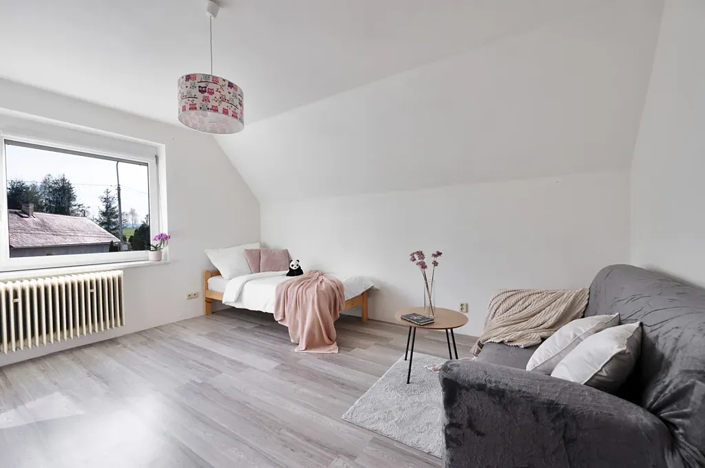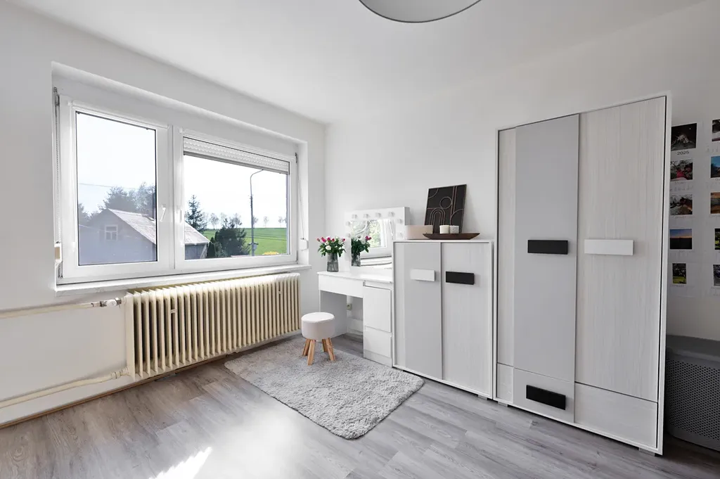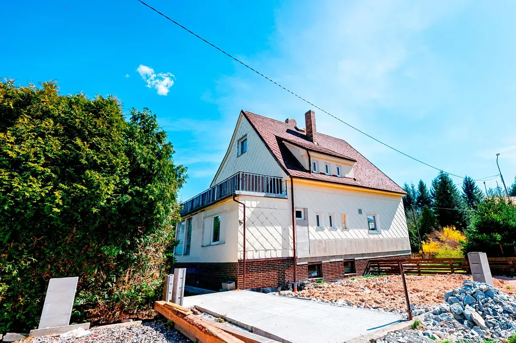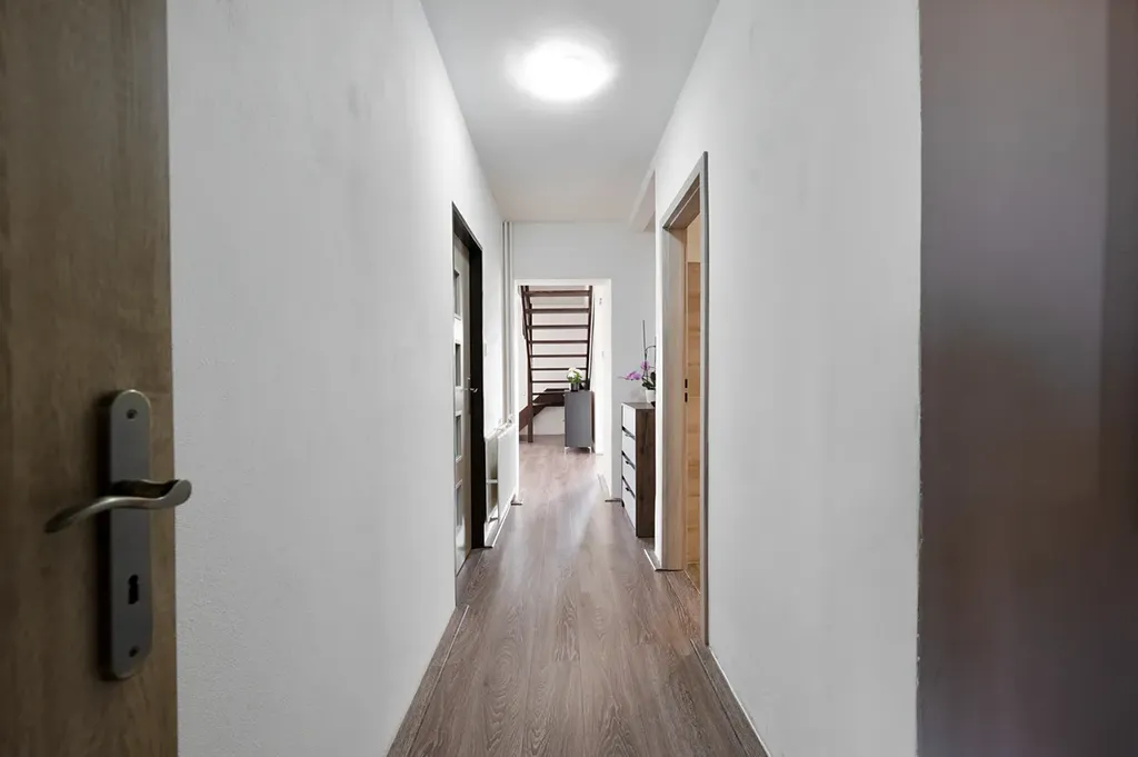 Současná dispozice domu je 5+1, přičemž v podkroví jsou připravené další dva pokoje, které lze jednoduše dokončit. Dům tak můžete kdykoliv rozšířit, nebo ho díky zachovanému původnímu schodišti pohodlně rozdělit na dvě samostatné jednotky – ideální pro více generací nebo pro propojení bydlení s podnikáním.