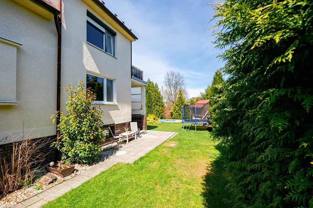 Pozemek o výměře 924 m² je rovinatý, udržovaný a lemovaný vzrostlými stromy, které zajišťují dostatek soukromí.