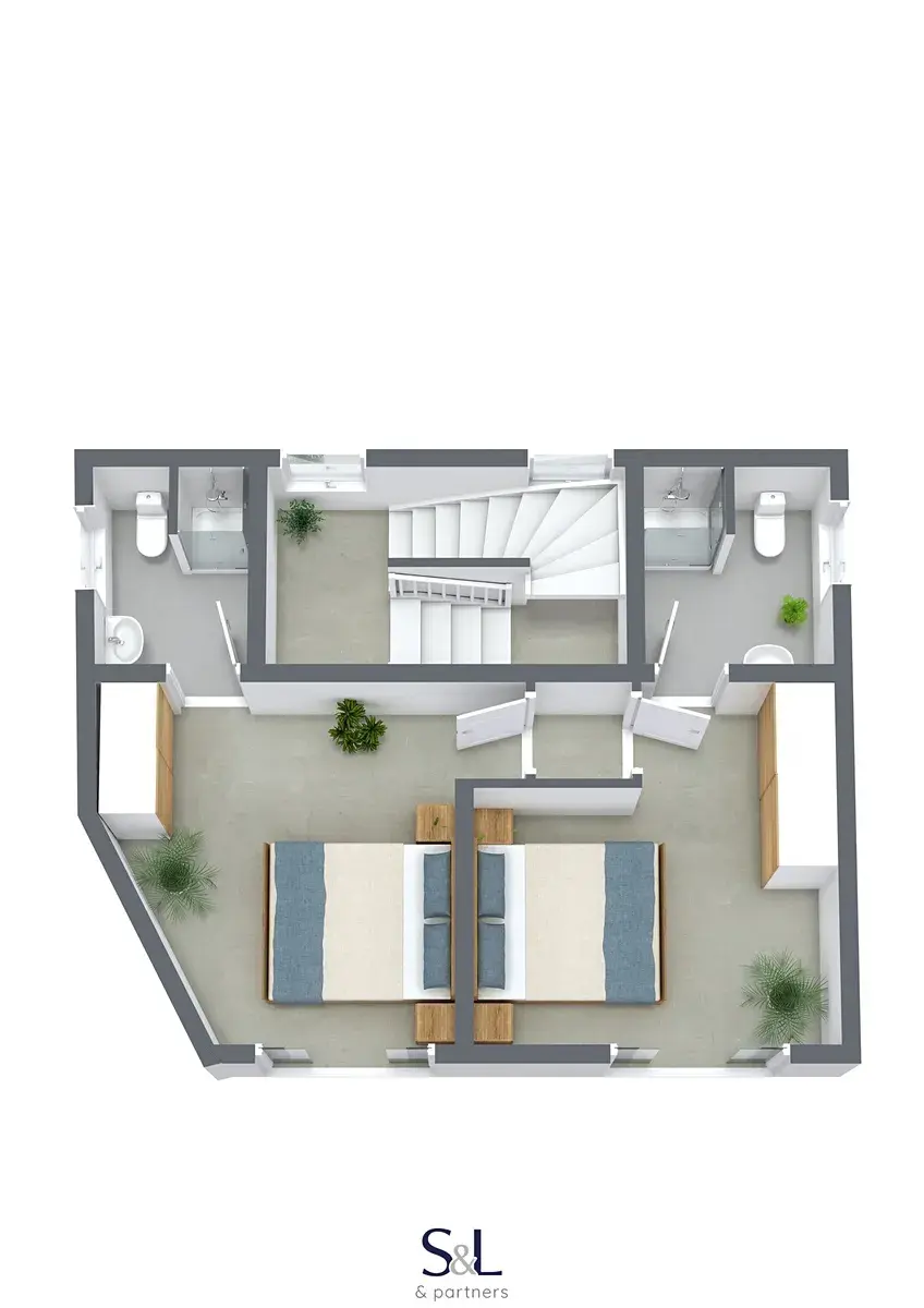 - První patro – Dvě ložnice, každá s vlastní koupelnou, schodiště a chodba.