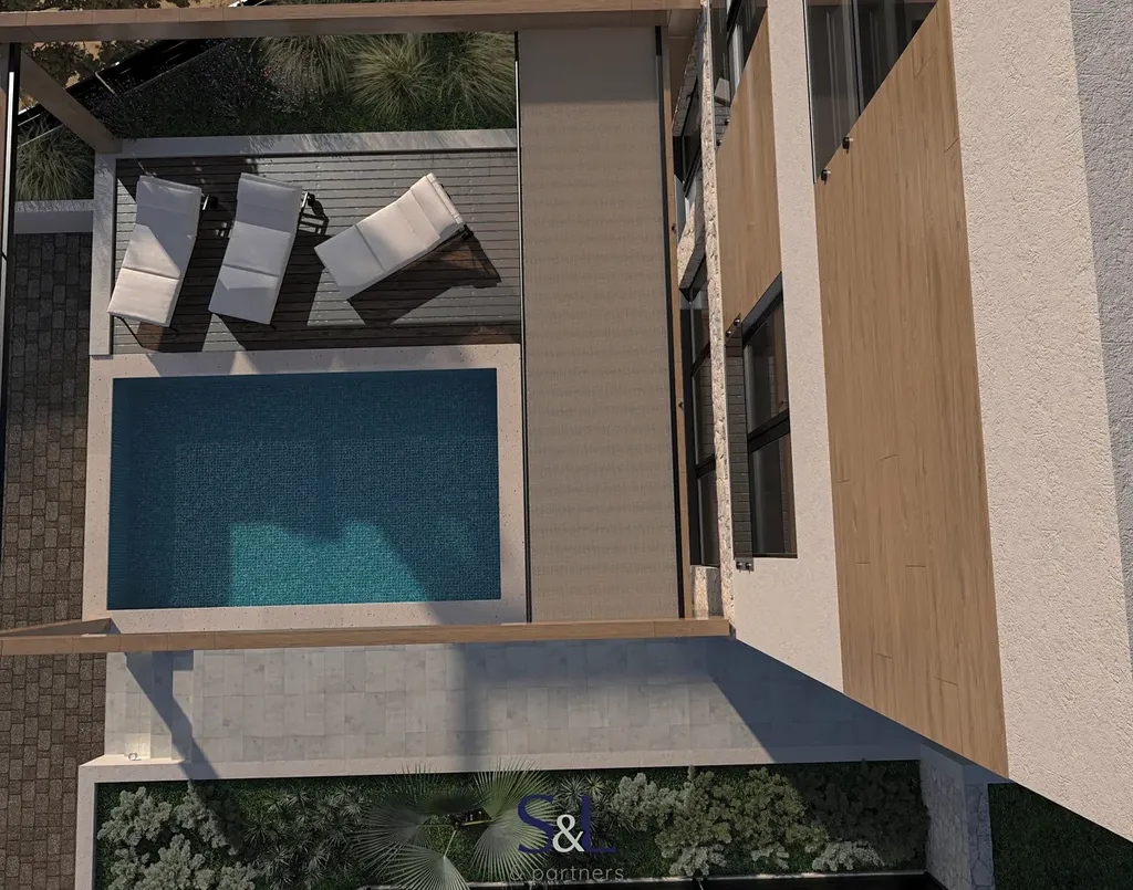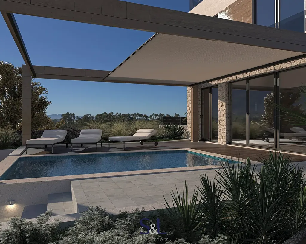 Jeden z největších benefitů vily je venkovní bazén 5 x 3 metry, který je vybaven moderní technologií pro udržitelnost a pohodlí. Ohřev vody zajišťuje teplené čerpadlo, čistění probíhá pomocí elektrolytické filtrace slanou vodou, která minimalizuje použití chemie a je šetrnější k pokožce.
