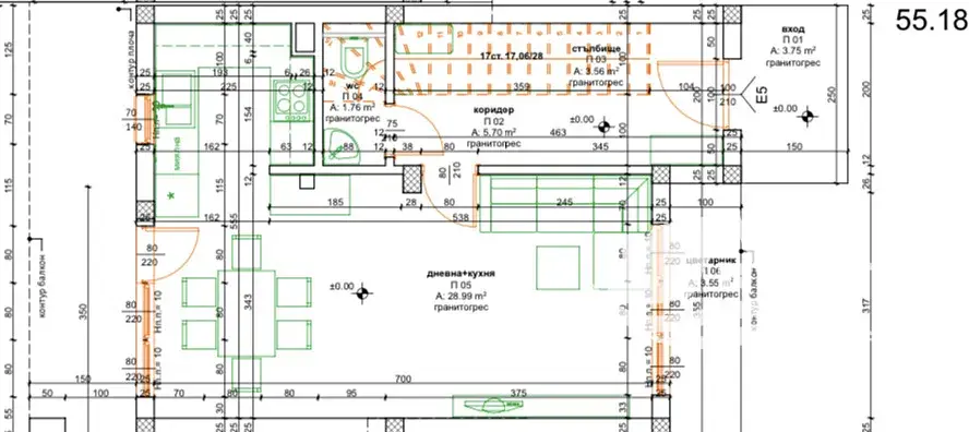 Dispozice: obývací pokoj s kuchyní a jídelnou, dvě ložnice, šatna, dvě koupelny s toaletou, dvě terasy