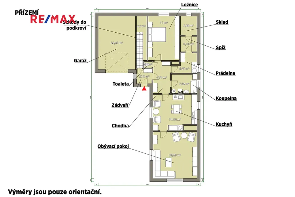 Praktickou část domu tvoří velká garáž, prádelna, samostatné WC a dvě nadzemní sklepní kóje / skladovací prostory – ideální pro sportovní vybavení, dílnu či zahradní techniku. Velkým benefitem je také prostorná půda s možností půdní vestavby, která nabízí potenciál rozšíření obytné plochy dle potřeb nové rodiny.