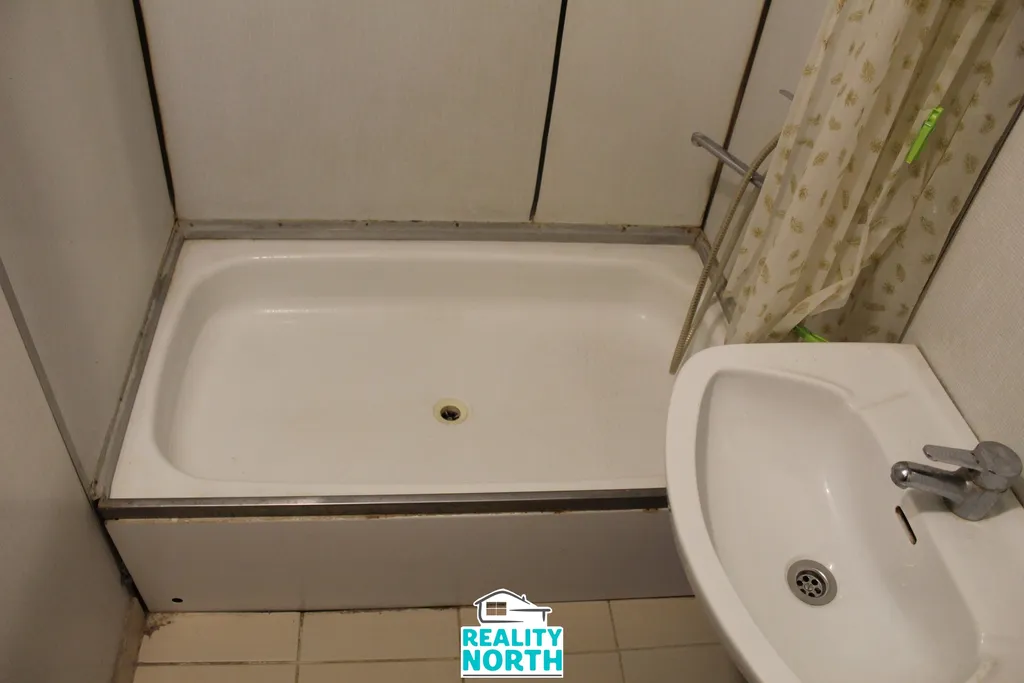 V místnosti a na chodbě je položeno linoleum, v koupelně a na WC dlažba.