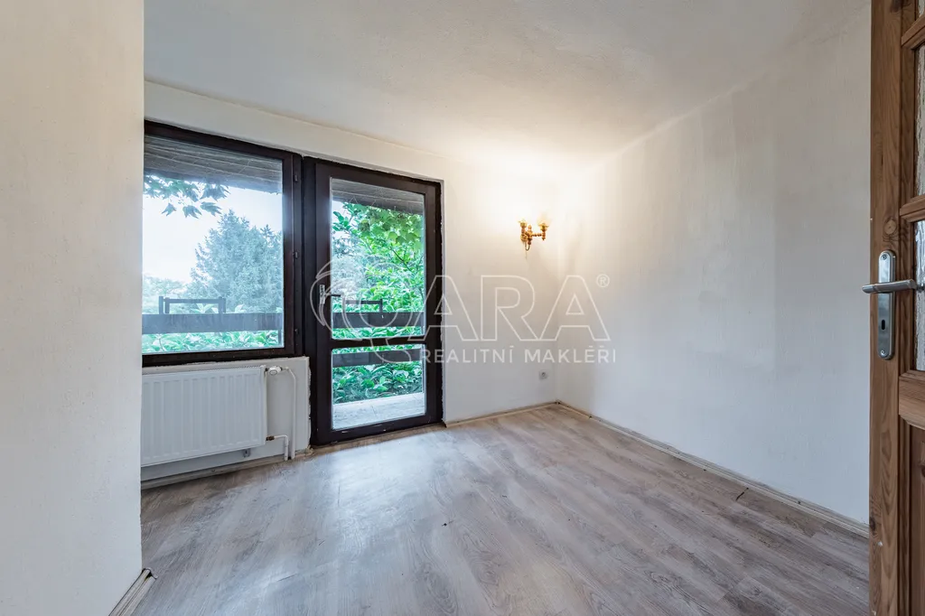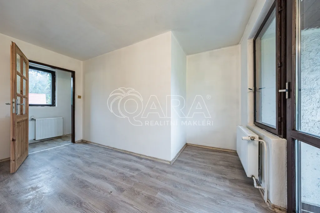 Druhé podlaží: dvě útulné ložnice s plovoucí podlahou, z obou je vstup na prostornou terasu s krásným výhledem do okolní zeleně. V tomto podlaží jsou původní dřevěná okna, která zachovávají původní charakter chaty.