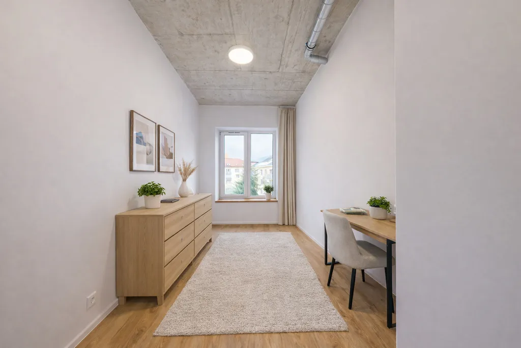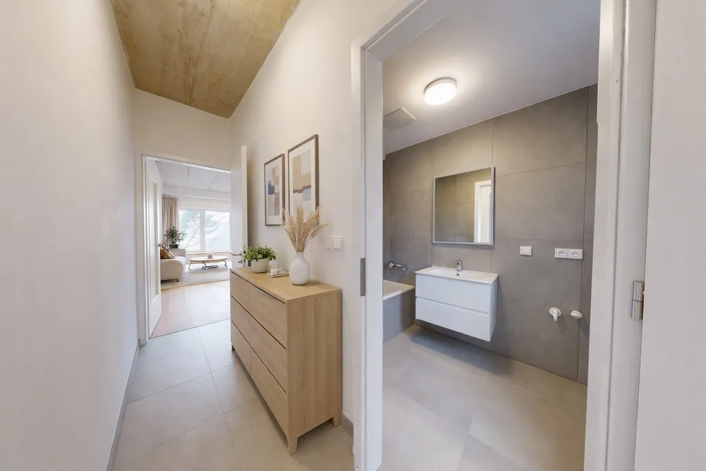 Byt zaujme hned při vstupu – dlouhá, světlá chodba s pohledovým betonovým stropem vytváří působivý první dojem a zároveň nabízí dostatek prostoru pro úložné řešení. Už tady je patrný charakter celého bytu: moderní, čistý a lehce industriální.
