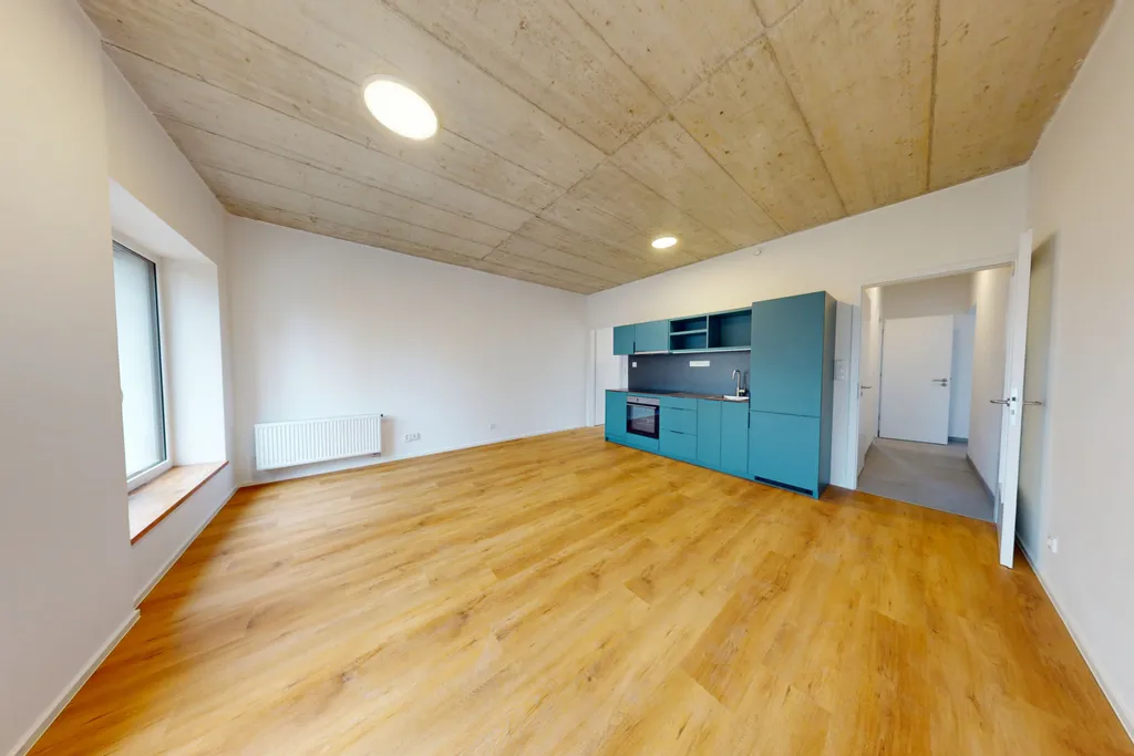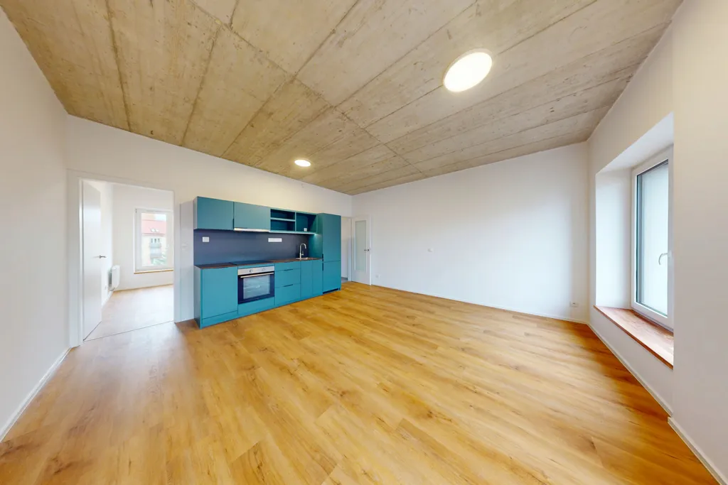 Dominantou hlavní obytné části je designová tyrkysová kuchyňská linka, která prostoru dodává energii a osobitost. Kuchyně je vybavena vestavěnými spotřebiči značky Siemens, takže spojuje výrazný vizuální prvek s kvalitou a praktičností pro každodenní vaření. V kombinaci s dřevěnou podlahou a surovým betonovým stropem vzniká nadčasový kontrast, který působí velmi současně a přitom útulně. Otevřená dispozice přirozeně propojuje kuchyň s obývací částí a nabízí dostatek světla i prostoru pro relaxaci a běžný každodenní život.