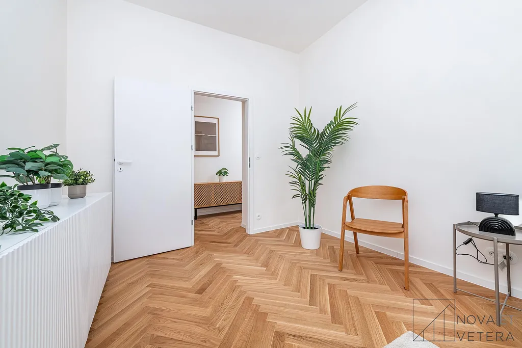 Vysoký standard kompletní rekonstrukce zahrnuje nové rozvody elektřiny, vody a odpadů. Dále rekonstrukce zahrnuje dřevěné parketové podlahy, kvalitní velkoformátové obklady a dlažbu od italského dodavatele MARAZZI. V koupelně a na toaletě naleznete sanitu značky GROHE. Moderní kuchyňská linka disponuje mimo jiné kvalitními spotřebiči značky BOSCH a zapuštěným granitovým dřezem.