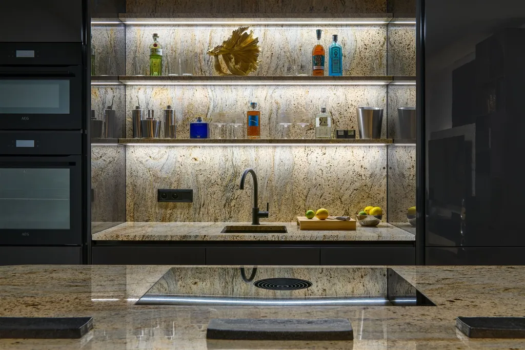 Kuchyňská linka s veškerými spotřebiči včetně potřebného vybavení (sklenice, talíře, hrnce atd.).