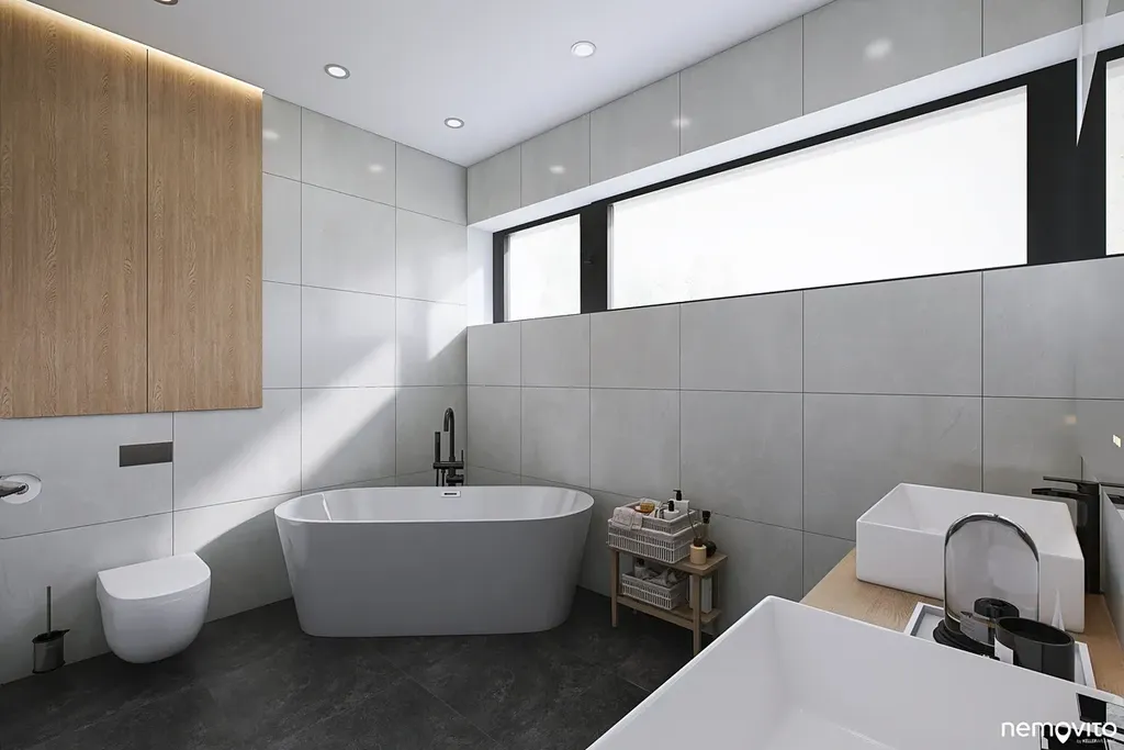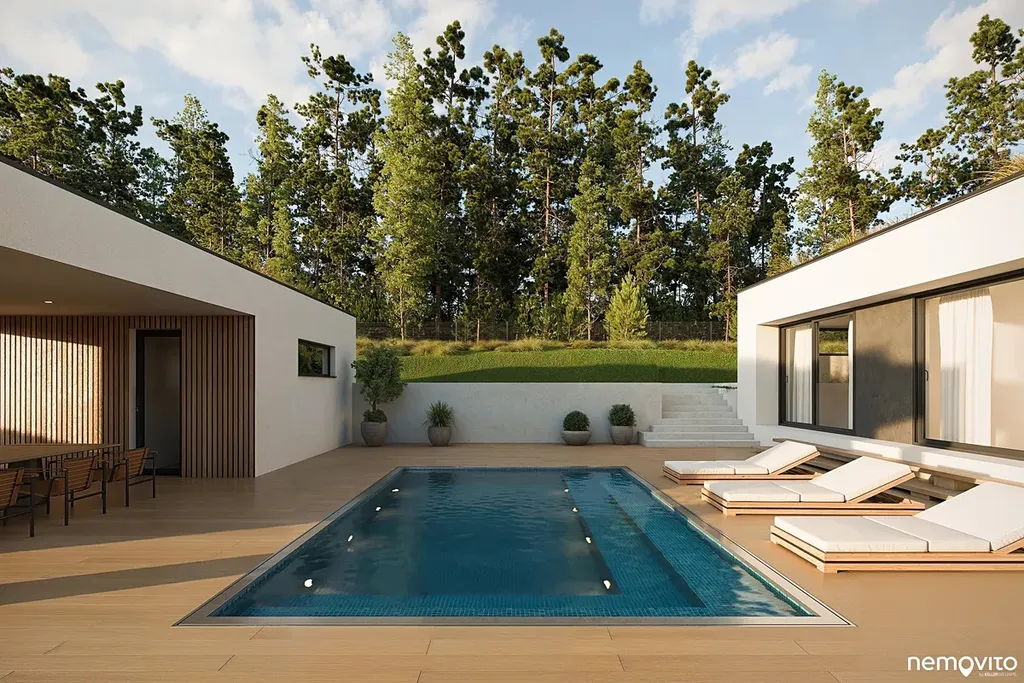 V úrovni příjezdu se nachází garáž na 2 auta a krytý přístřešek pro auto návštěv, dále nechybí sklad. Druhému podlaží dominuje téměř 60 m2 obývák s prosklením ze 3 stran. Ten nabízí přístup k atriu s bazénem nebo výstup na jižní krytou terasu, jejíž pojetí oživuje výřez střešní konstrukce pro umístění stromu. Severní část domu je věnována ložnicím a koupelnám, přičemž v jižní části domu nechybí ani pokoj pro hosty.