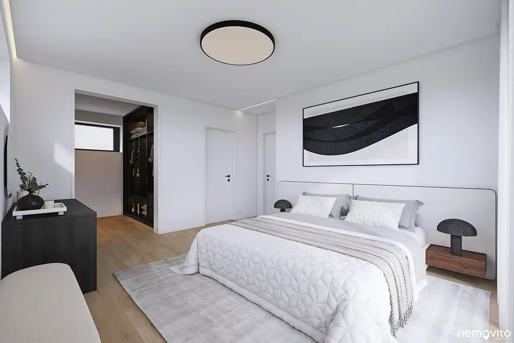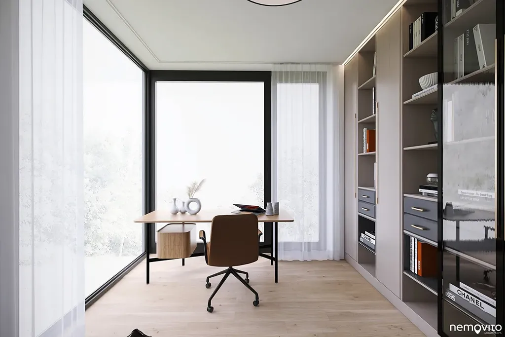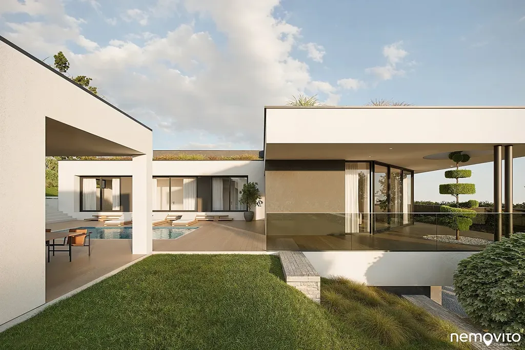 Dům o dispozici 5+kk (292 m2 plochy) nabízí ve 2 podlažích komfort, který nespočívá pouze ve velkorysé ploše, ale taktéž smysluplně řešené dispozici s téměř 100 metrovým suterénem. Vila, která svým pojetím navazuje na myšlenky funkcionalismu, hojně pracuje s velkou prosklenou plochou, která prostřednictvím precizně orientovaných výhledů těží maximum z konkrétního místa. Je zároveň navržena tak, aby od sousedního navrhovaného objektu maximálně filtrovala svůj provoz. Za tímto účelem vzniklo působivé vnitřní atrium s bazénem a letní kuchyní.