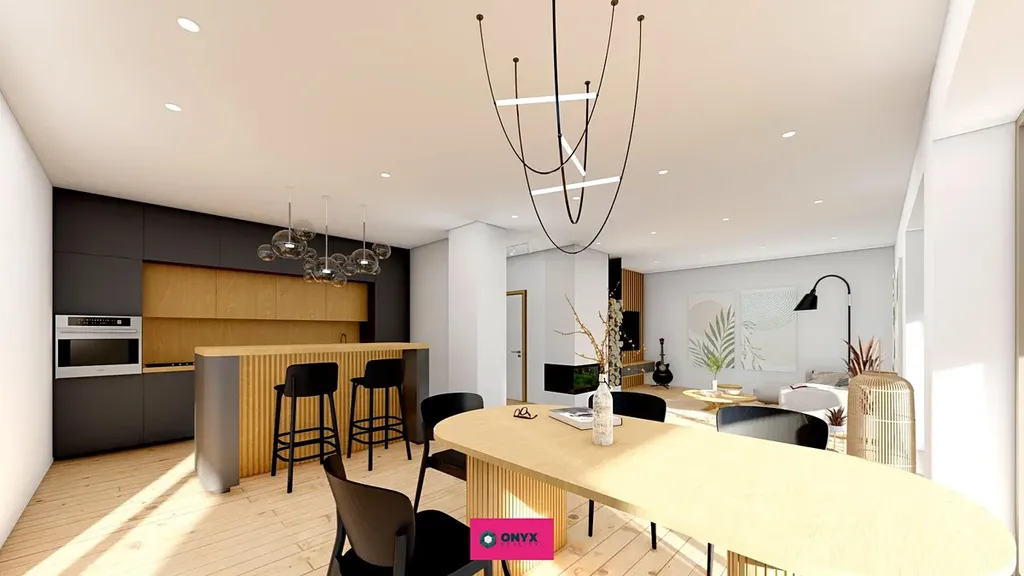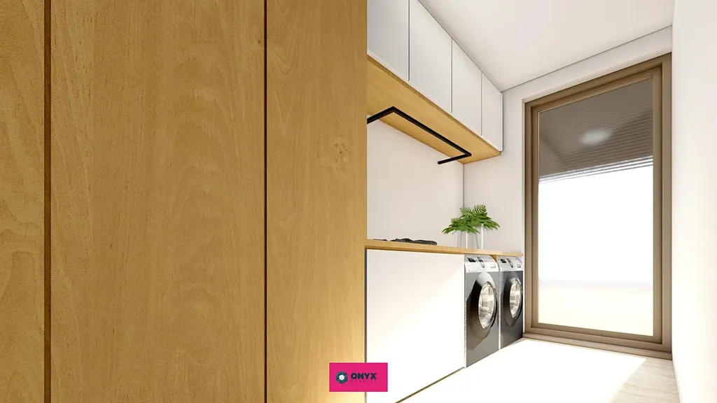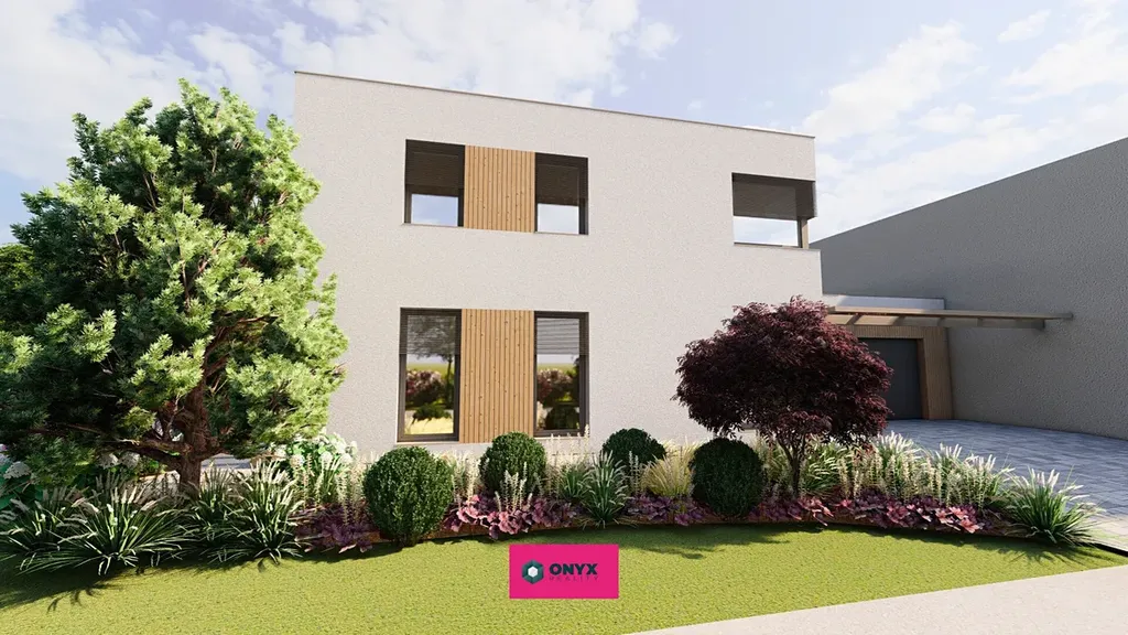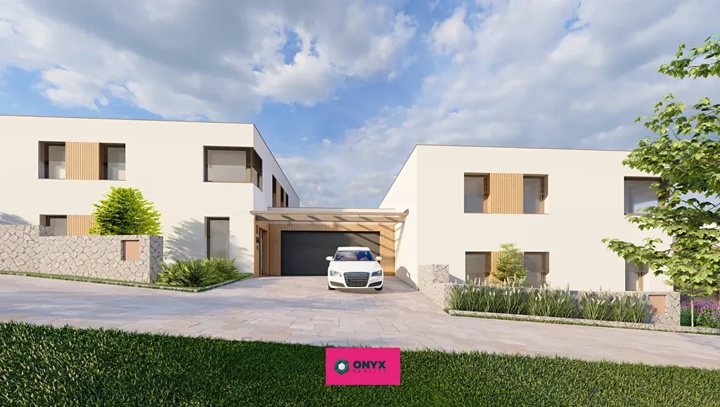 Nabízíme ke koupi velký moderní, nízkoenergetický - ve Třídě A - rodinný dům se dvěma plnohodnotnými podlažími, rovnou střechou a propracovaným dispozičním řešením. Dům disponuje šesti obytnými místnostmi, velkým obytným prostorem (obývací pokoj s kuchyní o velikosti 46 m² s prosklenou stěnou do "L" s přímým vstupem na terasu s HS portálem), třemi koupelnami, třemi toaletami a dvougaráží. Praktickým bonusem je samostatná prádelna s velkým francouzským oknem.