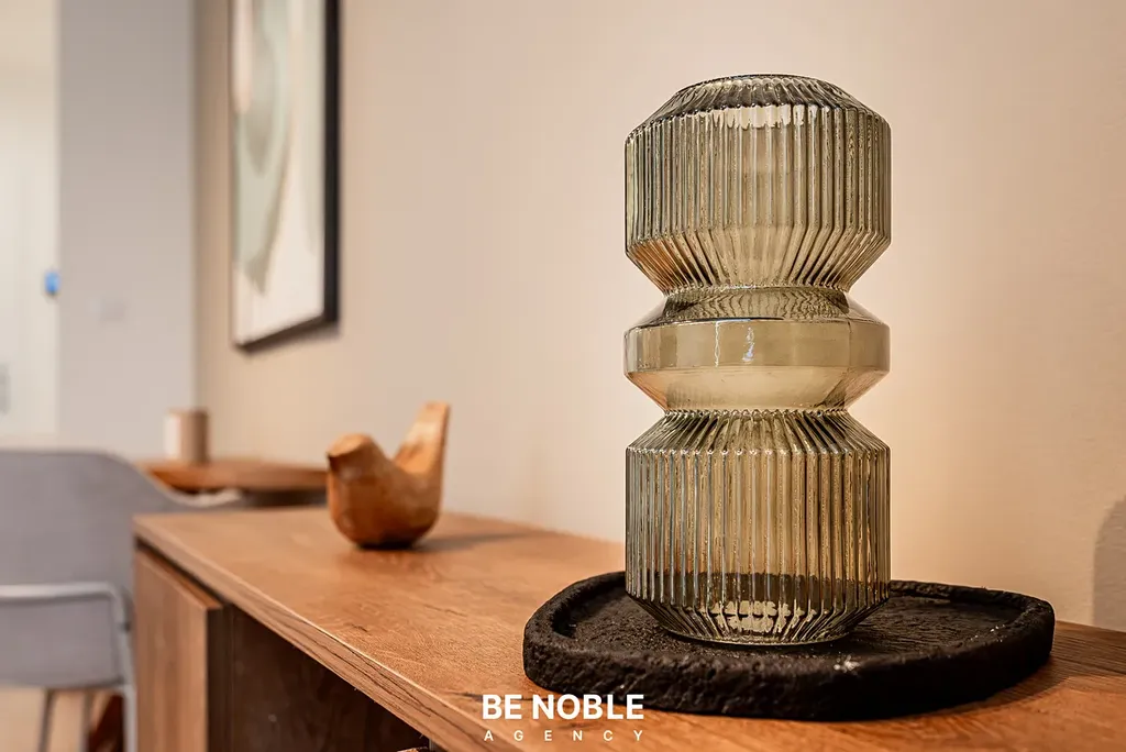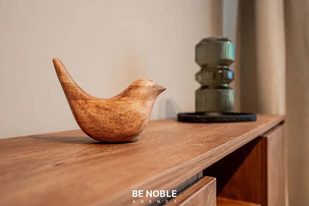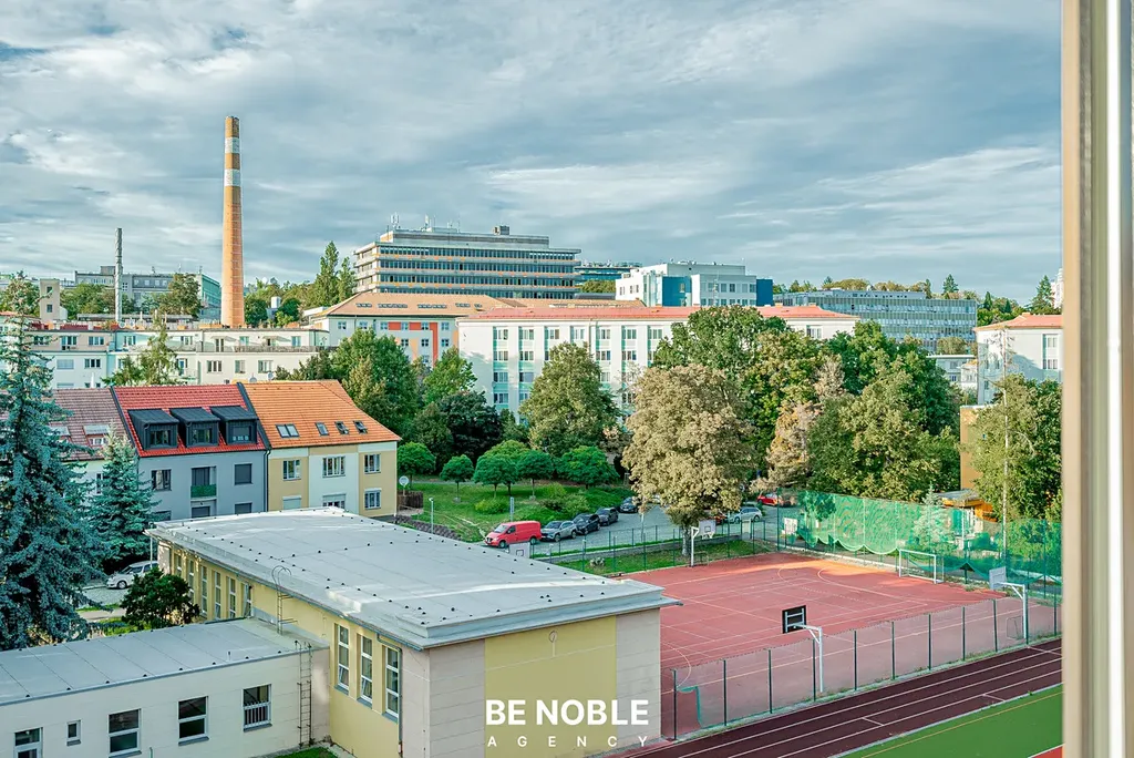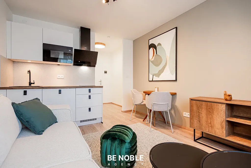 Byt byl navržen tak, aby dokonale využil každý centimetr prostoru a zároveň působil útulně i elegantně. Součástí je moderní kuchyňská linka s dostatkem úložných prostor, varnou deskou, lednicí, mikrovlnnou troubou a vestavěnou digestoří. Obytná část je vybavena kompletním nábytkem, dekorem a osvětlením od společnosti Bonami v celkové hodnotě přes 350 000 Kč – tedy nejen kuchyní, ale i pohovkou, komodou, stolem, závěsy, záclonami a designovými svítidly. Výsledkem je byt, který je připraven k okamžitému užívání nebo pronájmu – bez nutnosti dalších investic. Velké okno orientované do klidného vnitrobloku zajišťuje dostatek světla a příjemný výhled z 5. patra. V koupelně se nachází sprchový kout, toaleta a úložné prostory pod umyvadlem.