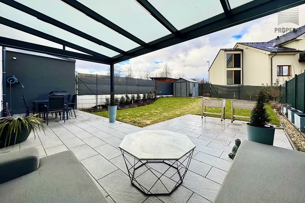 Přímo za domem naleznete sportoviště, dětské hřiště, psí výběh i prostor pro procházky, které jsou pohodlně dostupné ze zadního vstupu přes zahradu. Ta nabízí příjemnou klidovou zónu s hliníkovou pergolou vybavenou sreenovou roletou, venkovním posezením a praktickým zahradním domkem pro uskladnění nářadí. Trávník osazen automatickou závlahou napojenou na retenční nádrž o velikosti 3,5 kubíků. Dále voda pro obsluhu zahrady vyvedena na terase. Okna s el. ovládanými venkovními žaluziemi. Parkování před domem pro 2- 3 auta.