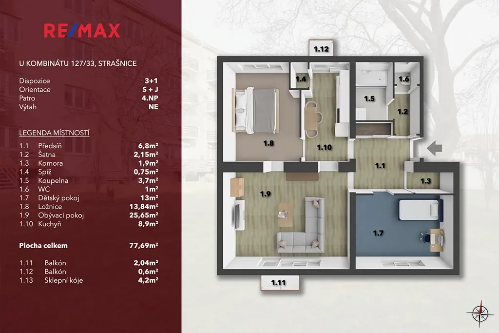 K tomu sklep 4,2 m² a dva balkony (2,04 m² + 0,6 m²).
