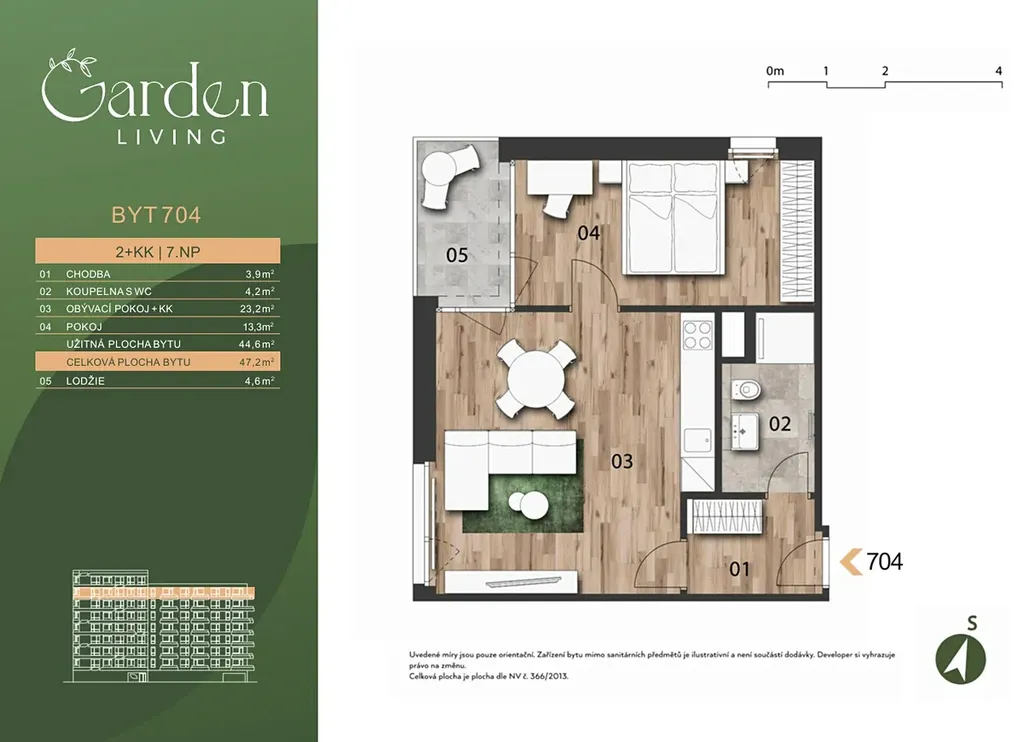 Nabízíme exkluzivní byt 2+kk o celkové výměře 44,6 m2, který je umístěn v sedmém patře budovy s výtahem. Součástí bytu je i lodžie 4,6 m2.