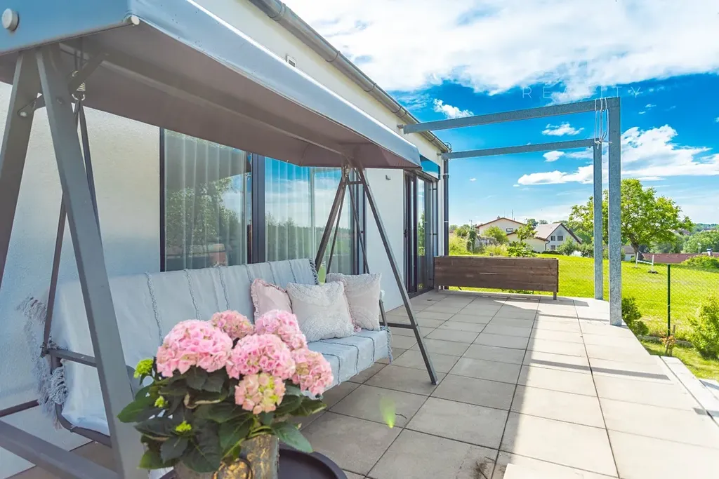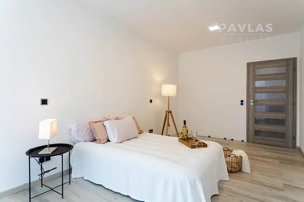 Dům disponuje třemi samostatnými neprůchozími ložnicemi, z nichž největší má rozlohu 16 m² a přímý přístup na terasu. Moderní stylová koupelna je vybavena dvěma umyvadly, prostorným sprchovým koutem a vanou. Další toaleta je přístupná z chodby. Před domem je kryté parkovací stání pro dvě auta, s možností vybudovat další parkovací místa. Z terasy vede vstup na zahradu, kde najdete vzrostlé ovocné stromy, poskytující stín během horkých letních dnů, venkovní dílnu a vyvýšené truhlíky pro kutily.