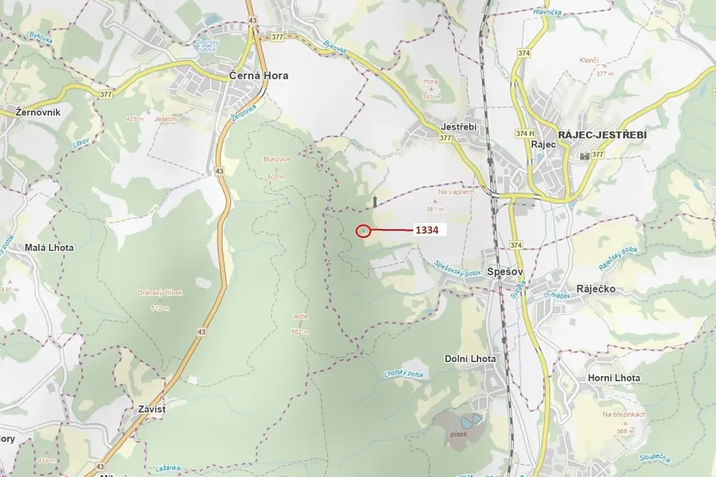 Lesní pozemek o výměře 420 m2, parcelní číslo 1334, podíl 1/1, katastrální území Spešov, obec Spešov, obec s rozšířenou působností Blansko, okres Blansko, Jihomoravský kraj.