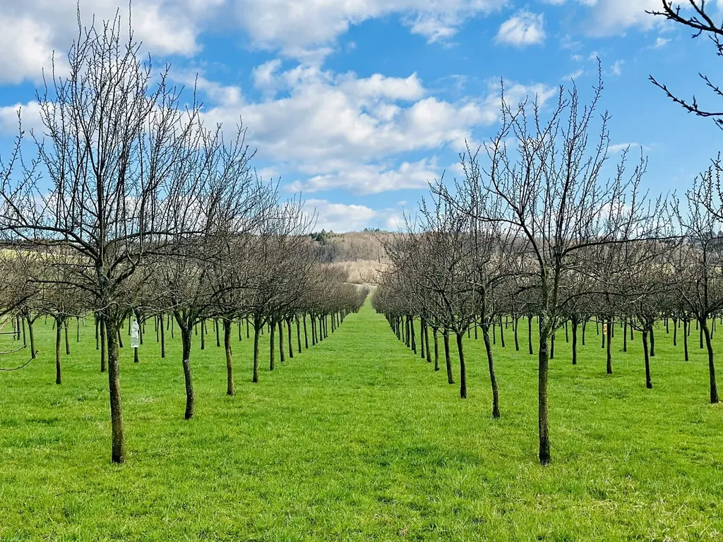 Sad byl vysazen v roce 2009. Obsahuje 5 odrůd slivoní, v průměru 400 stromů na hektar.