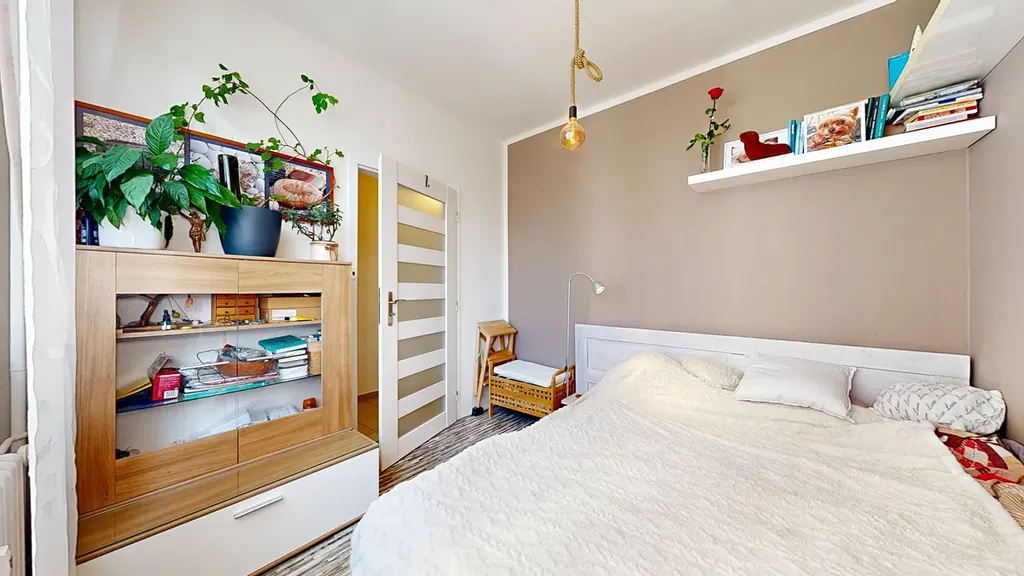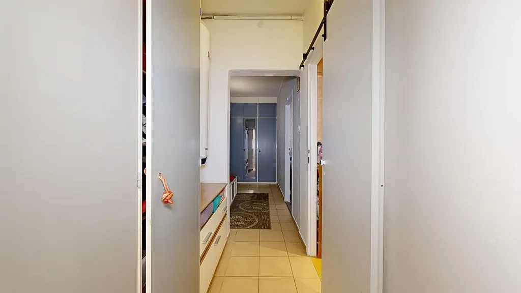 Byt je orientován na jihovýchod, sestává ze samostatné kuchyně (8 m2), obývacího pokoje (18 m2)se vstupem na lodžii, dále ze dvou ložnic (12 m2 a 8 m2),koupelny s vanou a samostatným WC. Přípojku a prostor na pračku naleznete v koupelně. Kuchyň je vybavena vestavnou lednicí, troubou, myčkou, elektrickým sporákem a digestoří. Výhodou bytu je množství vestavných úložných prostor v předsíni. Byt prošel před 5ti lety rekonstrukcí plovoucích podlah.Vytápění je dálkové, ale bytová jednotka má vlastní elektrický bojler na ohřev teplé vody.