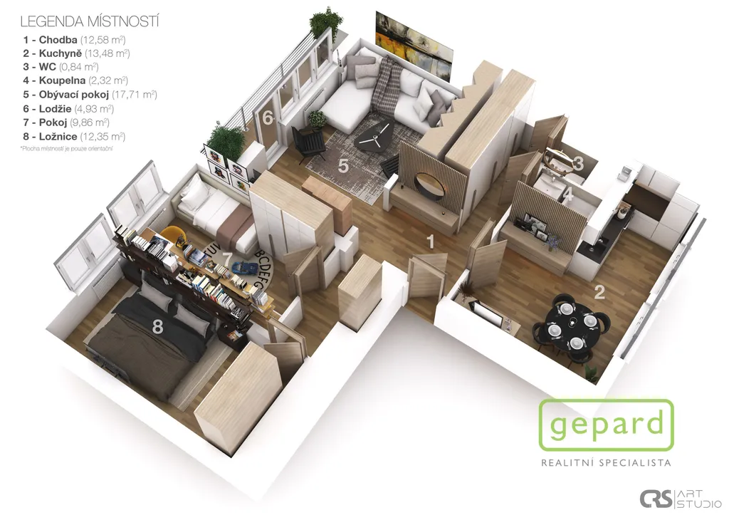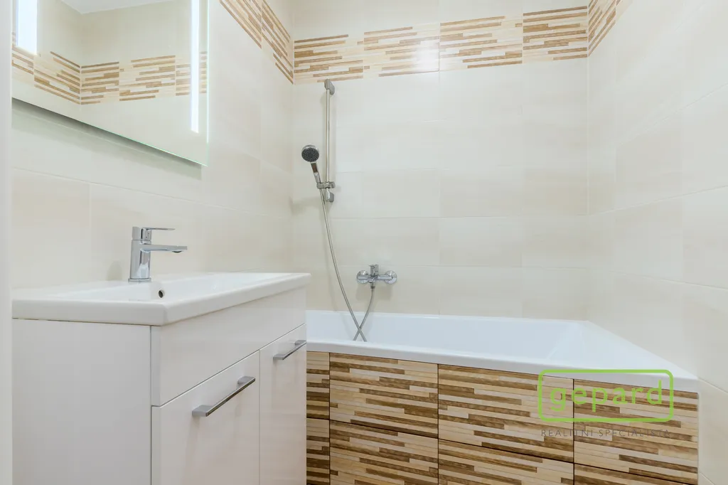 Interiér tvoří světlý obývací pokoj, samostatná kuchyně, dva neprůchozí pokoje, koupelna s vanou a samostatná toaleta. Příjemným benefitem je lodžie o velikosti 6 m², která poskytuje prostor pro odpočinek či posezení, a také sklepní kóje o velikosti 3 m², nabízející praktický úložný prostor.