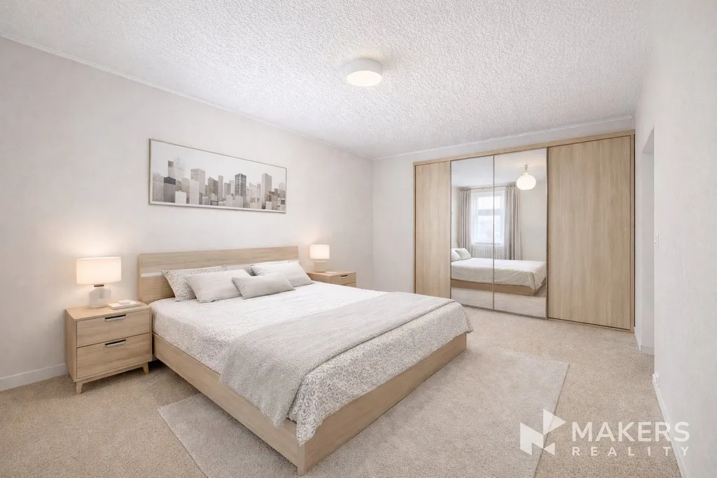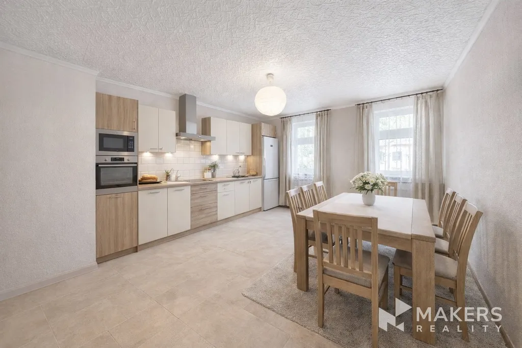 Byt je v původním, avšak velmi pečlivě udržovaném stavu, a je tedy ihned obyvatelný. Zároveň poskytuje zajímavý potenciál k úpravám dispozice podle vlastních potřeb. Současné uspořádání zahrnuje dvě velké obytné místnosti, samostatnou kuchyň s jídelním koutem, koupelnu s rohovou vanou, oddělené WC a předsíň. Díky velikosti místností je možné dispozici částečně změnit – například přesunout kuchyň do obývacího pokoje a z původní kuchyně vytvořit dětský pokoj, pracovnu nebo další ložnici. Tím vzniknou dvě neprůchozí místnosti, například samostatná ložnice a dětský pokoj, což ocení zejména rodina nebo ti, kteří potřebují oddělený pracovní prostor.