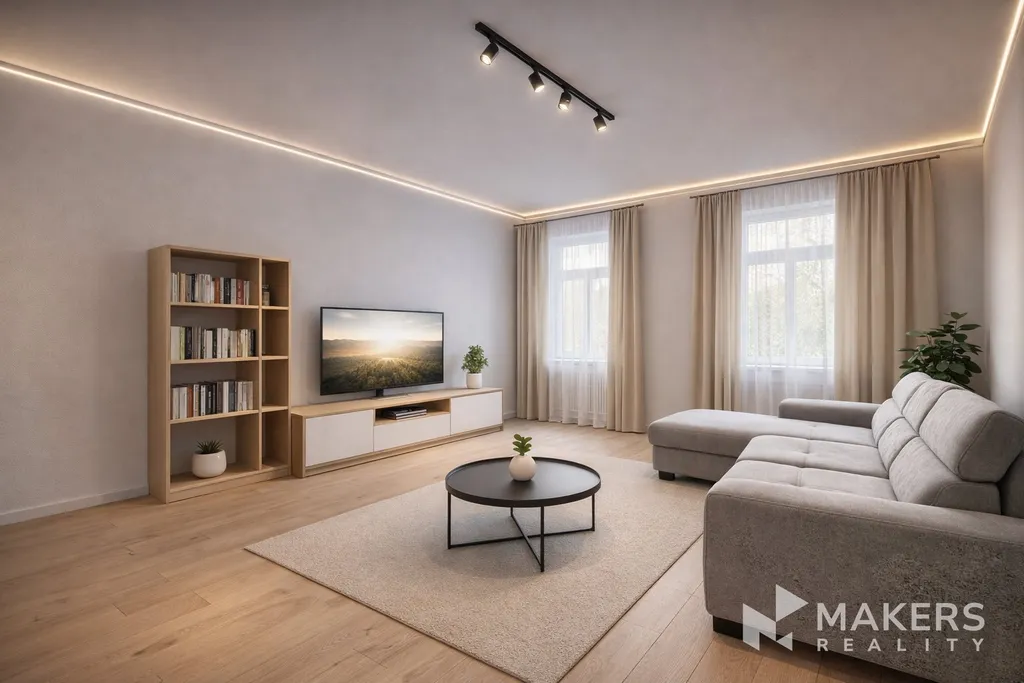 Vysoké stropy a praktické rozvržení místností podtrhují vzdušnost celého bytu a dávají novému majiteli možnost vytvořit moderní a funkční bydlení podle vlastních představ. Součástí inzerátu jsou také vizualizace interiéru, které znázorňují možný vzhled bytu po rekonstrukci. Fotografie s virtuálním zařízením slouží jako inspirace a ilustrativní představa budoucího stavu nemovitosti.