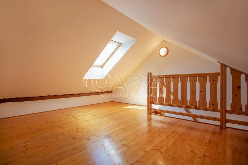 Dispozice bytu je řešena jako mezonet, což jej výrazně odlišuje od běžné nabídky menších bytů. Spodní část tvoří vstupní předsíň s prostornou vestavěnou skříní, obytný prostor s kuchyňským koutem a koupelna s vanou a WC. Do horního patra, kde se nachází samostatná ložnice, vedou dřevěné schody. Podkrovní provedení s přiznanými dřevěnými trámy dodává interiéru osobitý charakter a příjemnou atmosféru. Díky umístění v podkroví působí byt velmi světlým a vzdušným dojmem.