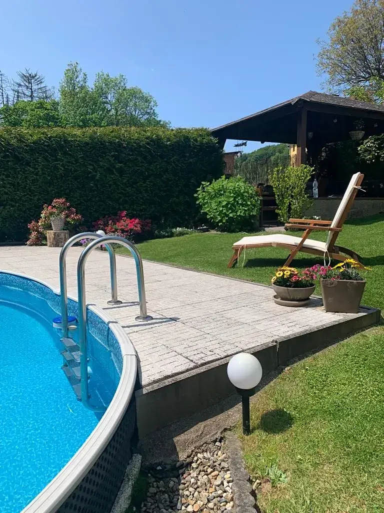 Zděný patrový dům s přiznaným kamenným základem, venkovním krytým garážovým stáním, bazénem a zahradním domkem je osazen v zadní části terénně různorodé zahrady, která tak přirozeně vytváří soukromí a odděluje dům od místní komunikace. Dům je po rekonstrukci vhodný k okamžitému užívání.