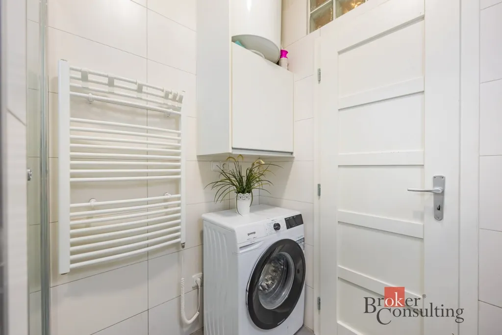 Koupelna je po moderní úpravě se sprchovým koutem a místem pro pračku. Obývací část s kuchyní tvoří příjemný prostor pro každodenní život i posezení.