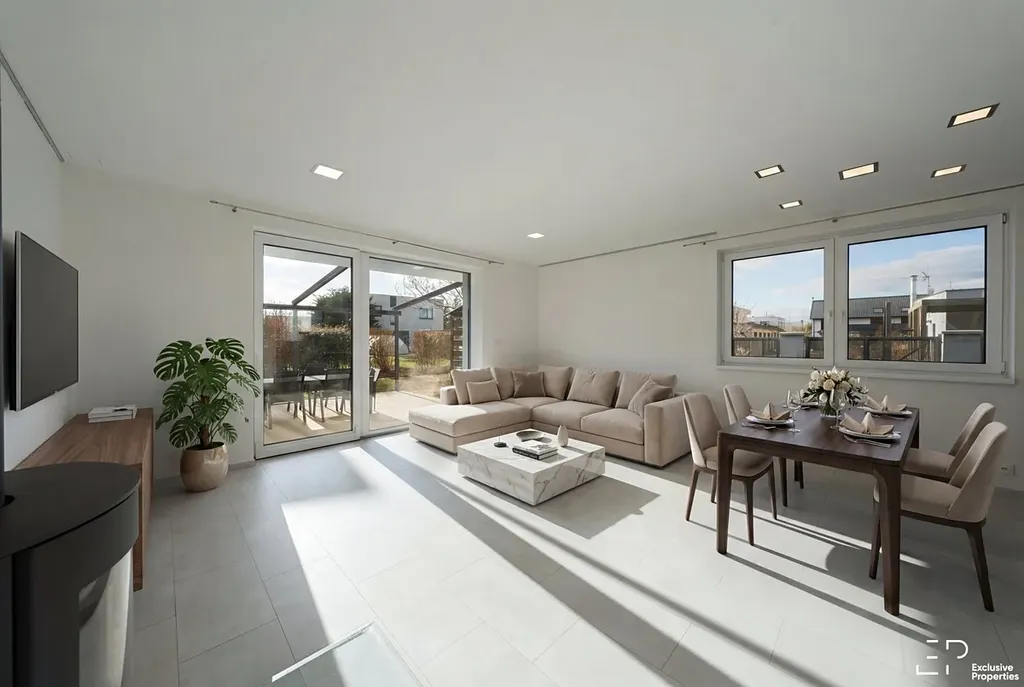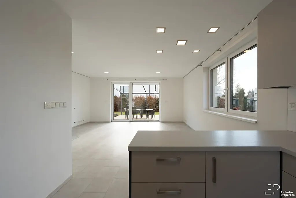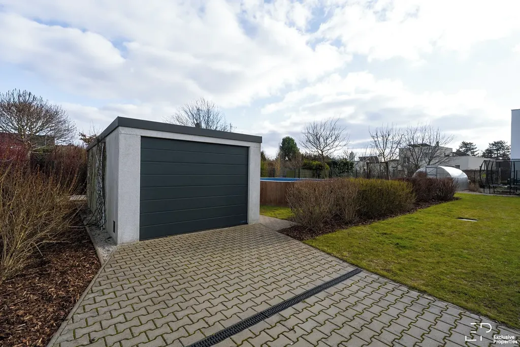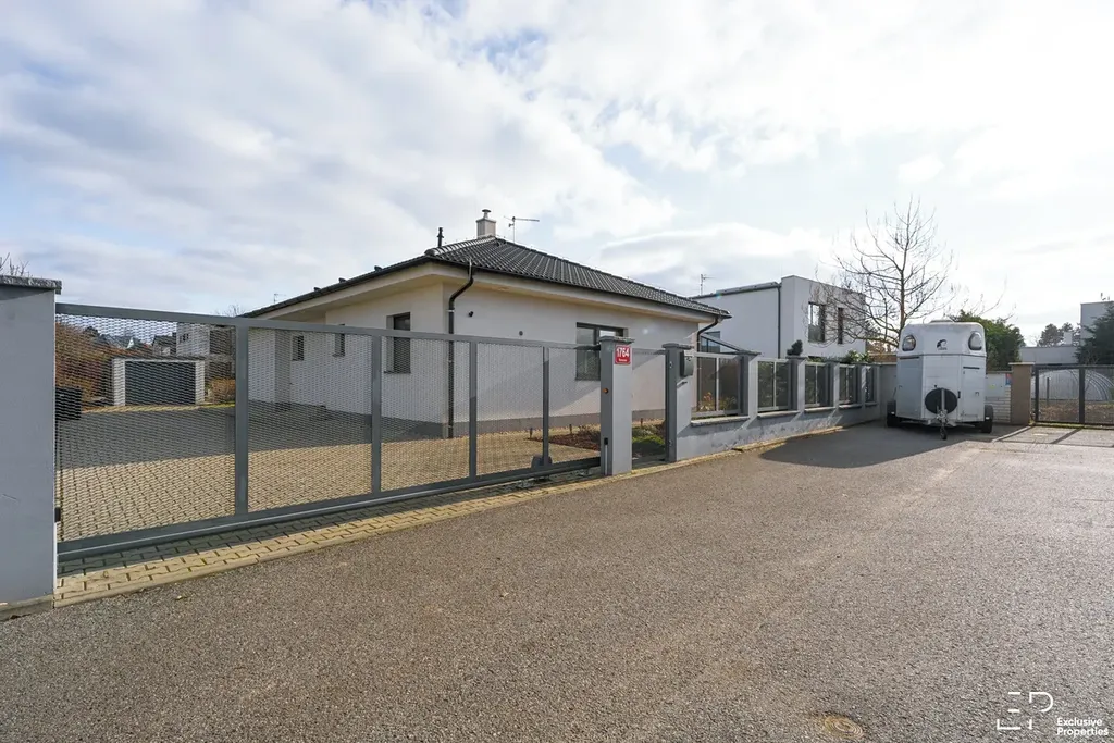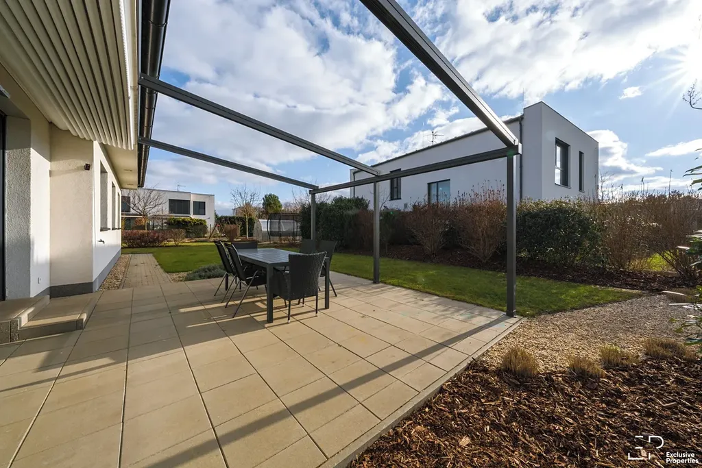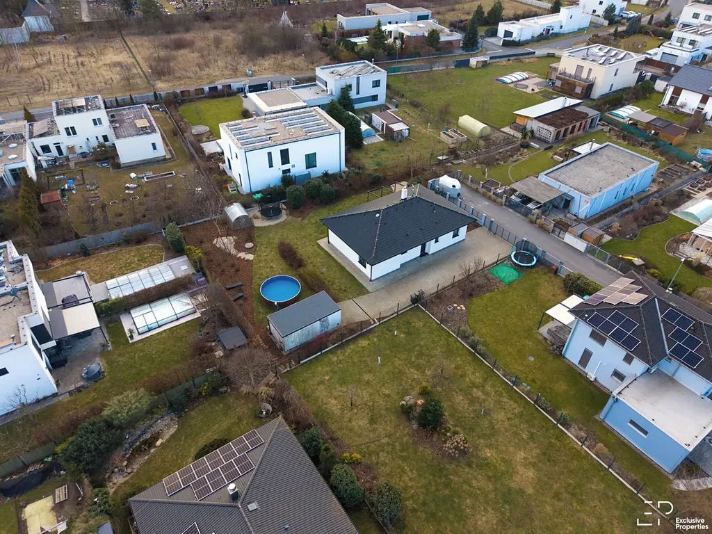 Výměra pozemku je 1056 m2. Podlahová plocha domu je 119 m2. Dispozice 5+kk. Orientace pobytové části zahrady JZ, Z. Prostorná terasa s posuvným zastřešením a zahradním nábytkem. Založená a udržovaná zahrada s automatickou závlahou, skleníkem a trampolínou. Případně po dohodě k využití nadzemní bazén.