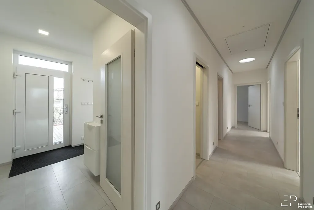 Obývací pokoj s kuchyní, navazující spíž. Snadný přístup na terasu a zahradu přímo z obývacího pokoje. K dispozici jsou i další čtyři pokoje, které je možné využít dle potřeb nájemníků, ideální variantou je rozdělení na ložnici, pracovnu a dva dětské pokoje. Koupelna s vanou, druhé WC, šatna, spíž a technická místnost.