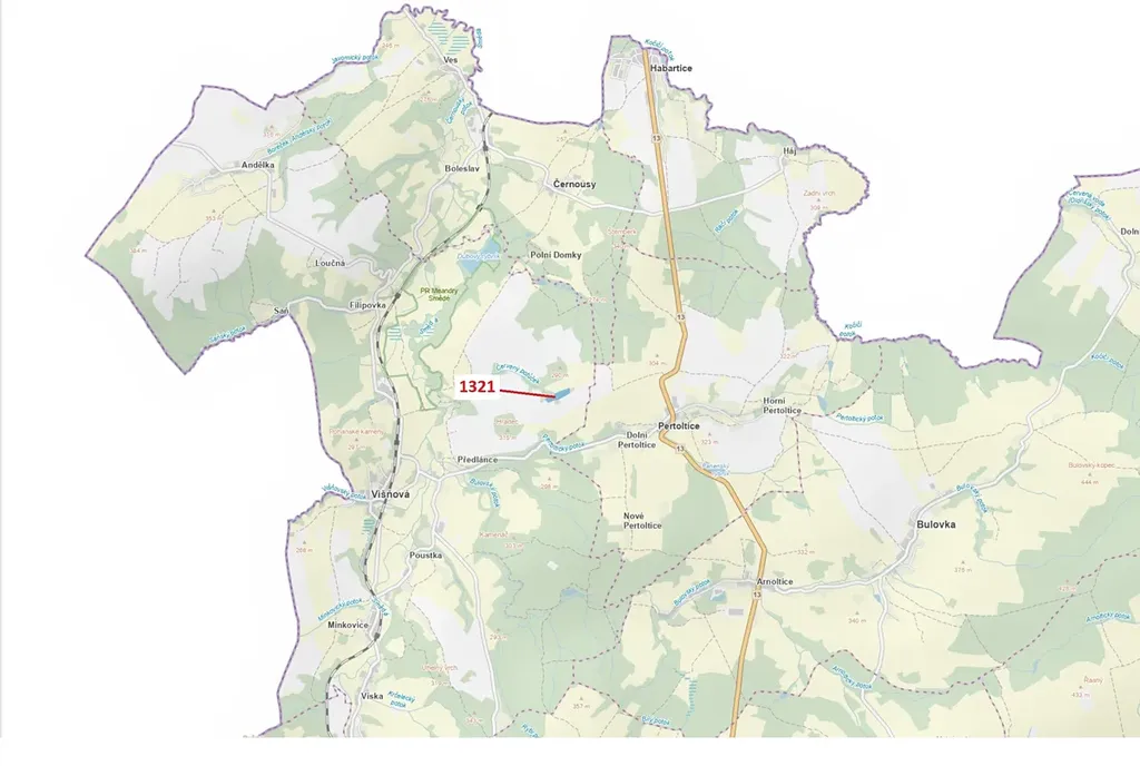Lesní pozemek o výměře 21 506 m2, parcelní číslo 1321, podíl 1/1, katastrální území Předlánce, obec Višňová, obec s rozšířenou působností Frýdlant, okres Liberec, Liberecký kraj. Po těžbě.