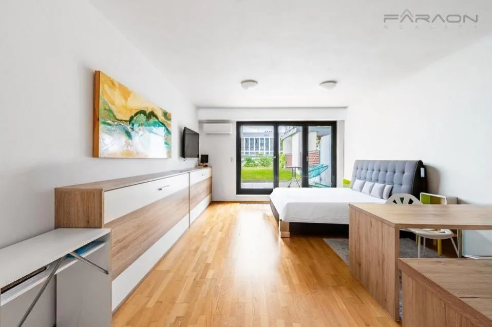 REZERVACE. Prodej moderního, kompletně vybaveného bytu 1+kk (37,4m2 + 9,4m2 terasa a s unikátní zahradou 49,3m2 ) a velkým sklepem (v ceně nájmu) v 6.podlaží domu v novostavbě bytového projektu Garden Tower s recepcí, ostrahou, v atraktivní části Prahy - na rozhraní Vinohrad a Žižkova se snadnou dostupností do centra Prahy. 8 minut tramvají od Václavského náměstí. Zastávka tramvají je přímo před domem. V minutové docházkové vzdálenosti stanice metra A Želivského a Flora.
