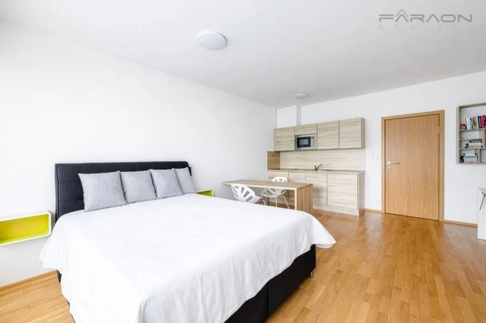 Dispozici bytu 1+kk bytu tvoří otevřený prostor obývací části s jídelním prostorem a kuchyní v bílém lesklém designu v kombinaci s dřevem, s působivými prosklenými francouzskými okny a výhledy na panorama Prahy, dále prostorná koupelna se sprchovým koutem, samostatná závěsná toaleta zvlášť, vstupní hala se zabudovanými šatními skříněmi. Veškerý nábytek je dělaný na míru, v ložnici je značková prostorná postel z masivu s kvalitní matrací. Dostatek úložných prostor je i ve sklepě, kde je na míru vybudovaný policový systém. k dispozici vymezené parkovací místo u domu 800 000,-