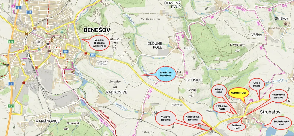 Struhařov je klidná obec s příjemnou atmosférou a základní občanskou vybaveností – obchod, restaurace, sportoviště. V okolí najdete rybníky, lesy a cyklostezky – ideální pro relaxaci, procházky i aktivní životní styl. Město Benešov je vzdáleno pouhých 5 minut autem – s veškerou občanskou vybaveností a vlakovým spojením do Prahy.