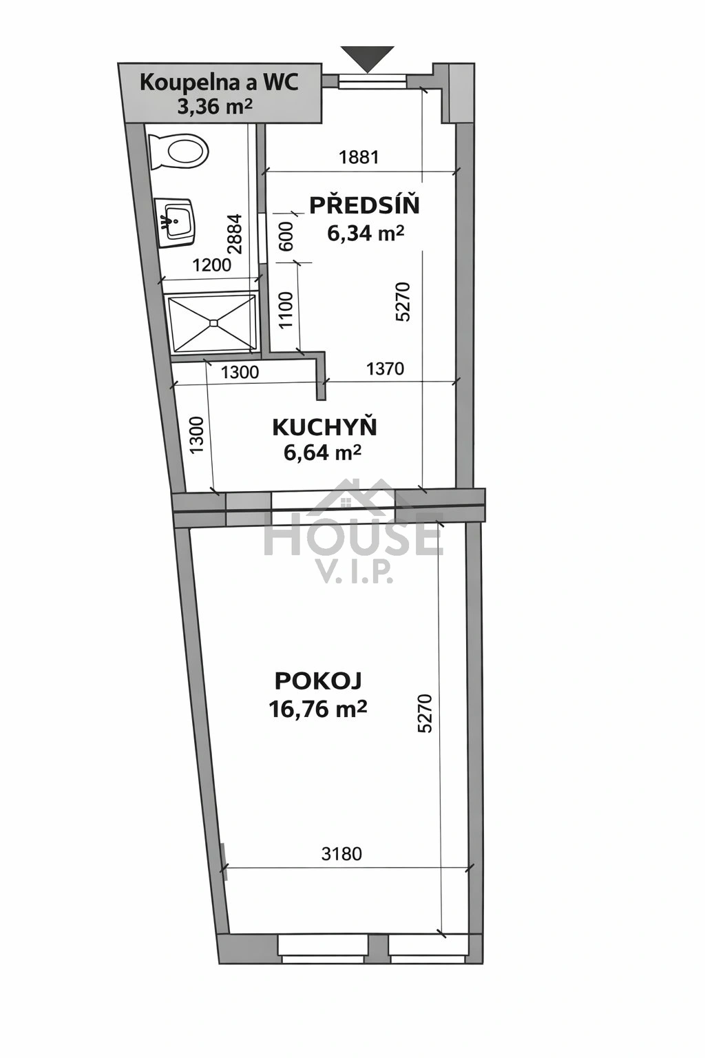 Dispozici tvoří vstupní předsíň s možností vestavěných úložných prostor, obytný pokoj s kuchyňským koutem a patrem na spaní, koupelna se sprchovým koutem, toaletou a pračkou.