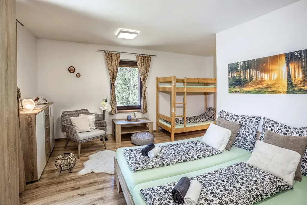 I.NP momentálně využíváno jako společné prostory. Ve II.NP 2 samostatné apartmány, každý s vlastní terasou a koupelnou s WC. V jednom z apartmánů na terase infra sauna.