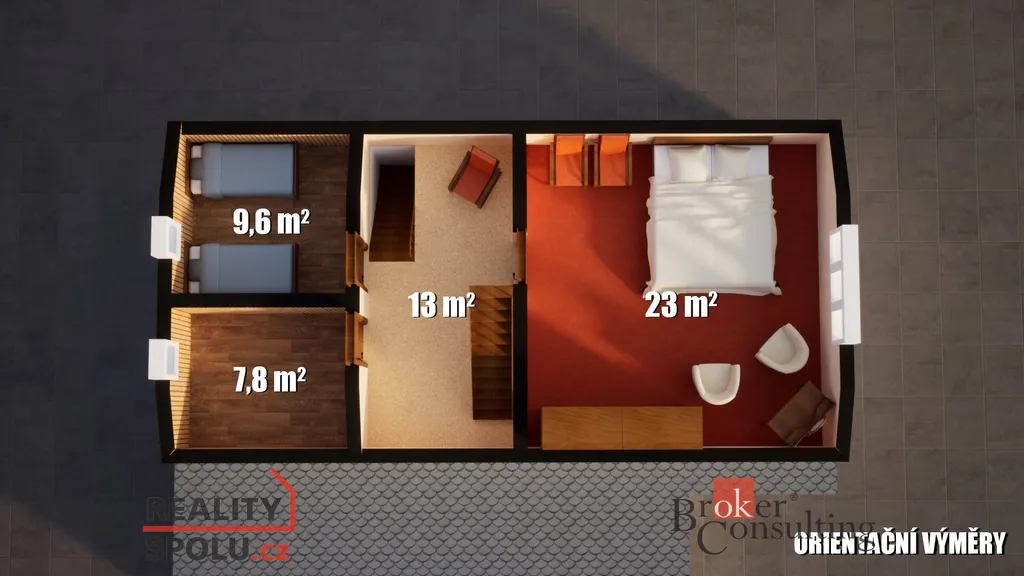 V přízemí se nachází vstupní chodba, dva pokoje, kuchyň, koupelna, špajzka a vstup na zahradu. V patře jsou další tři samostatné pokoje, které nabízí dostatek prostoru pro rodinu i hosty.