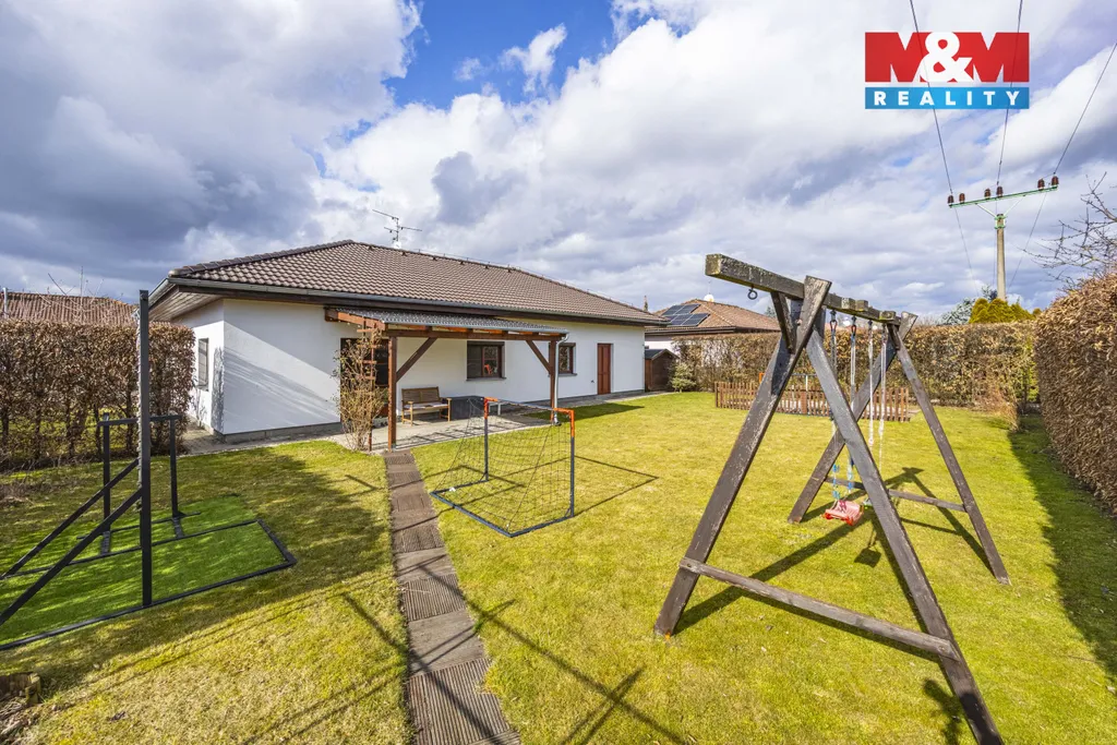Dispozice domu zahrnuje ložnici, dva dětské pokoje, koupelnu, samostatné WC, technickou místnost a garáž. O pocit bezpečí a klidu se stará kamerový systém.