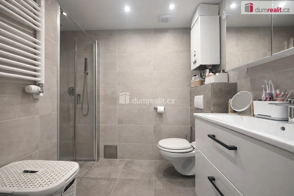 Koupelna je rovněž nově zrekonstruovaná a vybavená prostorným sprchovým koutem, toaletou a moderním sanitárním vybavením, které zajišťuje pohodlí při každodenním užívání.