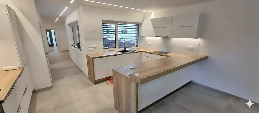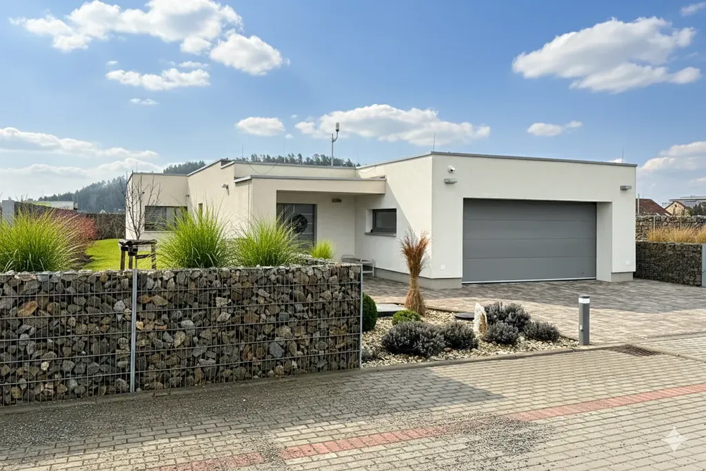 Rodinný dům zkolaudovaný v r. 2022 je zděný, jednopodlažní s rovnou střechou, garáží pro 2 osobní automobily 36 m² a venkovním parkovacím stáním pro další 2 auta. Zastavěná plocha 209 m², podlahová plocha 173 m².