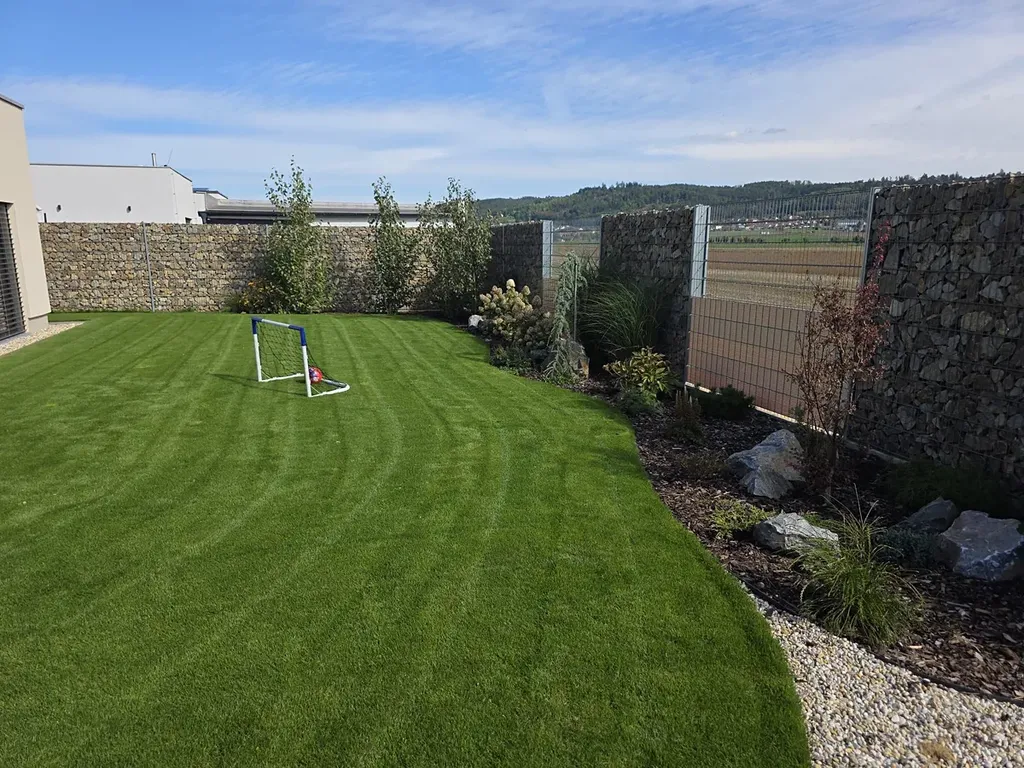 Zahrada o výměře 565 m² je bez dalších staveb, osázena travou, okrasnými keři a dřevinami, zakrslými stromky a sezónními květinami, je zde přívod elektřiny pro budoucí pergolu a zahradní domek. Na zahradě je vybudovaný zavlažovací systém, dětské pískoviště a průlezka.