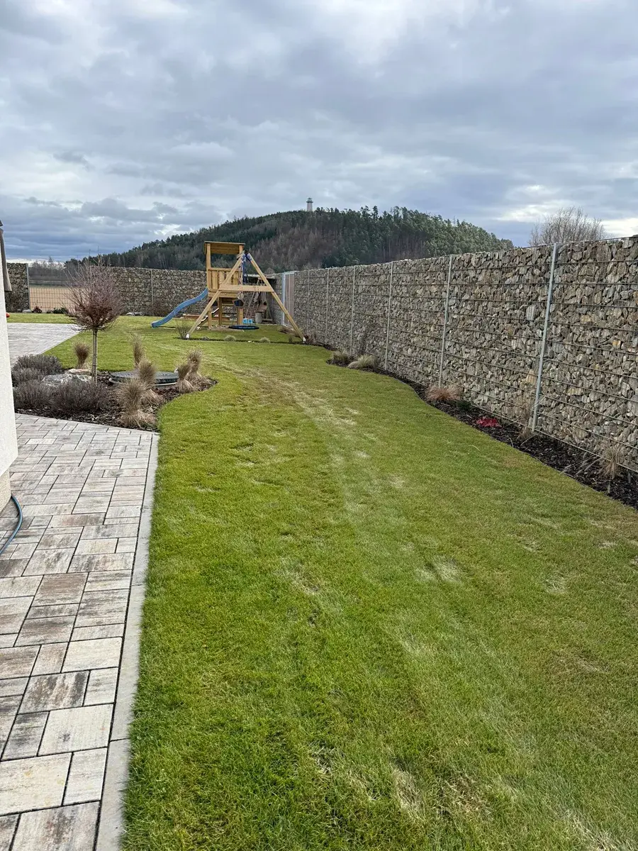 Pozemek je kompletně oplocený, plot je umístěný na vlastním pozemku, nikoliv na hranici se sousedním pozemkem. Plot je osazen dvojitou bránou pro vjezd a brankou pro pěší. Gabionový plot je v přední části pozemku vysoký 1,2 m, v zadní části dosahuje výšky 2 m.