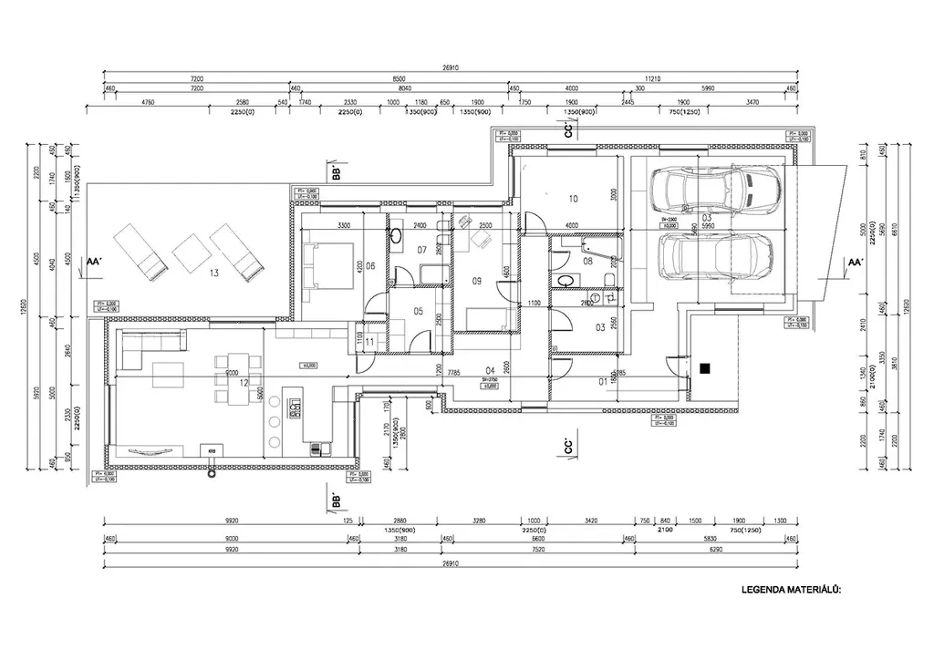Dům má dispozici 4+kk s terasou umístěnou na jih. Pokoj s kuchyňskou linkou v ceně 600.000,- Kč včetně veškerých vestavných spotřebičů má výstup na terasu o výměře 35 m². Z ložnice je vstup do šatny a koupelny s umyvadlem, sprchovým koutem, wc a bidetem. Z chodby je vstup do pracovny, dětského pokoje, druhé koupelny s umyvadlem, vanou a wc, a do technické místnosti s pračkou, sušička a bojlerem na ohřev vody. Vstupní předsíň ústí do garáže pro dva osobní automobily.