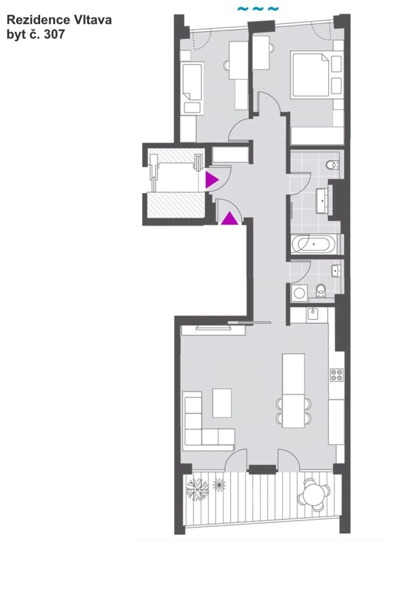 Byt se nabízí vybavený. Kuchyně disponuje lednicí, myčkou, elektrickou troubou, varnou deskou, mikrovlnnou troubou a digestoří. Prostorná obývací část se vstupem na lodžii je zařízena pohovkou, konferenčním a televizním stolkem. Součástí ložnice je postel a vestavěná skříň. V druhém pokoji najdeme pracovní stůl s židlí, komodu a válendu. V koupelně je vana, umyvadlo a toaleta. Druhá toaleta je umístěna samostatně. Na chodbě je k dispozici prostorná vestavěná skříň.