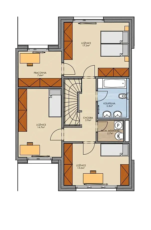 V patře jsou 3 samostatné pokoje, prostorná šatna, koupelna s vanou, sprchovým koutem a toaletou a technická místnost.