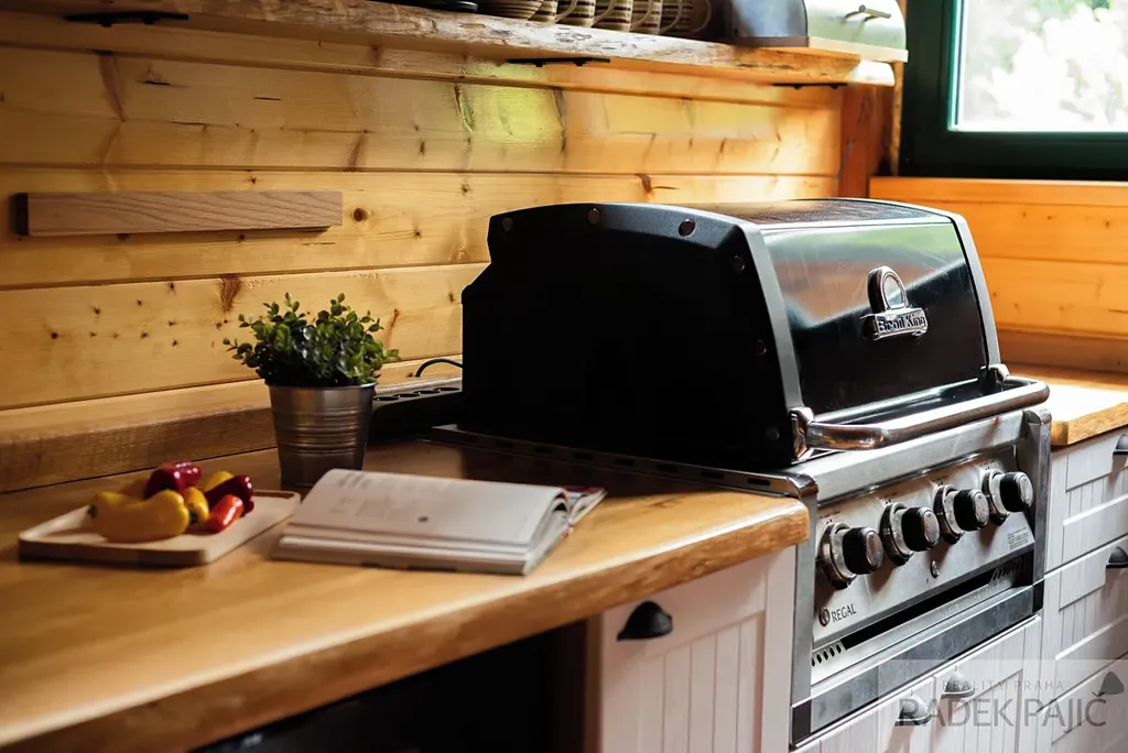 - Dvě plně vybavené kuchyně (v chatě i v pergole), betonové dřezy Blanco, spotřebiče Gorenje