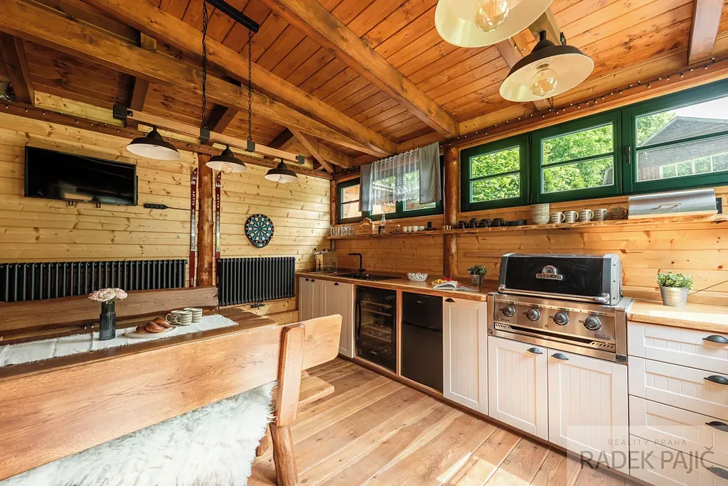 Prodej stylové chaty ve stylu srubu po kompletní rekonstrukci v trampské osadě Údolí Raků – klid, příroda a skvělá investice jen kousek od Prahy.