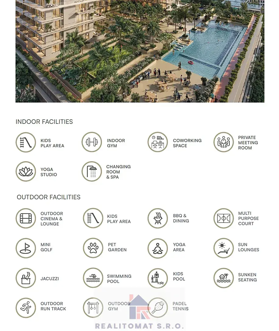 Tento projekt představuje jedinečnou investiční příležitost v dynamickém realitním trhu Dubaje, kombinující luxusní bydlení s bohatou nabídkou wellness vybavení.