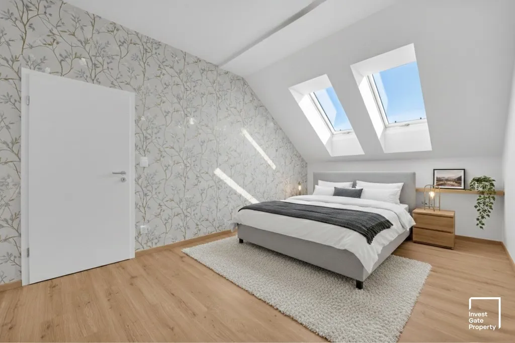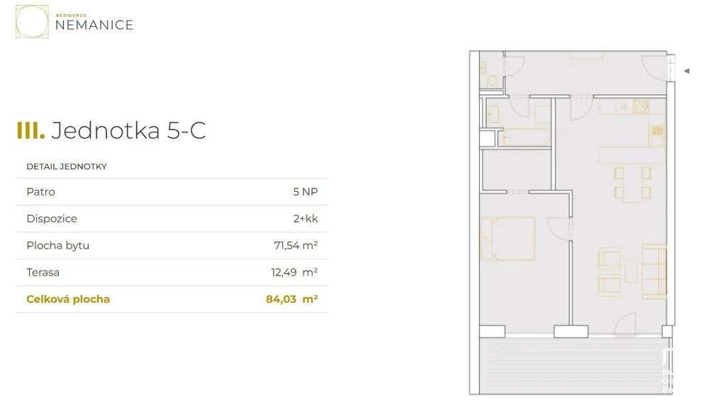 Dispozice bytu je 2+kk a jeho celková užitná plocha činí 100m2 (podlahová plocha bytu činí 70m2, terasa má výměru 12,5m2, kryté parkovací stání 15m2 a sklep 3m2). Byt se nachází ve 5. nadzemním podlaží domu – jedná se o podkrovní byt. Ložnice se střešními okny má skutečně nezaměnitelnou atmosféru a na terase je nad vámi jen obloha. Byt je orientovaný na východní stranu.